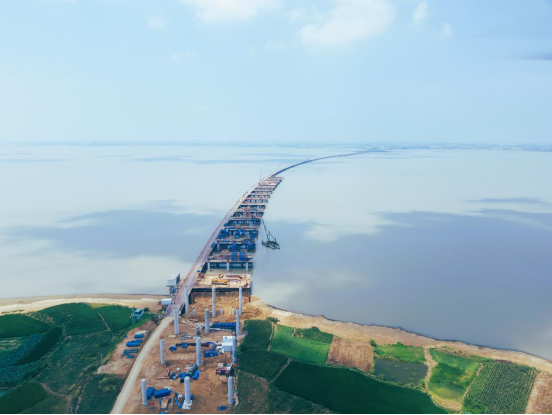 暑季以来,户外温度高,湖水被照射后形成水汽效应,加上水中平台均为钢板铺设温度极高,为桥面施工人员安全带来隐患。为确保人员安全和进度不受影响,一标一分部做好充足准备,加大人员投入,确保施工人员休息好、状态好;加大物资储备,确保防暑降温食品药品人人随时携带;优化施工时间,以早晚为主避开高温时段作业;设置纳凉休息区域,提供降温设备设施;挂图作战,合理安排施工工序,做到最优统筹;强化巡查管理,确保及时发现并消除各种安全隐患。当前,一标一分部日投入管理人员55人、施工人员530余人、各型机械设备130余台。截至目前,路基清表完成近5.7万方,完成占比72%;路基填筑完成近15万方,完成占比约17%。桥涵工程钻孔灌注桩完成近1100根,完成占比60%。桩基系梁完成91道,完成占比44%。桥墩承台完成58个,完成占比13.6%。桥梁下墩柱完成257根,完成占比26%。桥墩盖梁完成8道,完成占比1.6%。预制箱梁完成8片,完成占比0.2%。比预期进度大幅提前。
