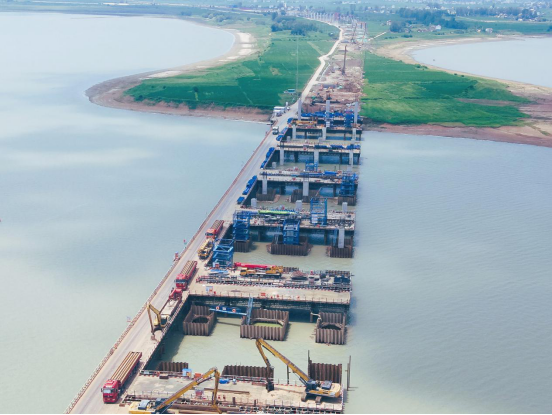 S20长丰至固始高速公路霍邱至皖豫界段项目一标一分部负责城东湖双层桥建设任务。该桥上层为高速,下层为328国道,该设计系我省首例、全国第三例,桥梁建设难度、设计标准以及施工要求均为我省之最。在市、县交通运输主管部门和当地政府全面保障下,桥梁建设高速推进,水中作业平台一块一块的铺设、水下桩基一根一根跃出湖面,为将来的桥面施工打下坚实基础。一标一分部积极参加市交通局组织的在建工程“劳动竞赛”活动,以“赛安全、赛质量、赛进度”为目标,以安全生产为基础、打造百年品质工程为导向、争先赶超进度为抓手,全面推进双层桥建设工作。与此同时,项目施工单位还高度重视湖面作业环境保护,确保工程施工对湖面及水下生物的影响降到最低。