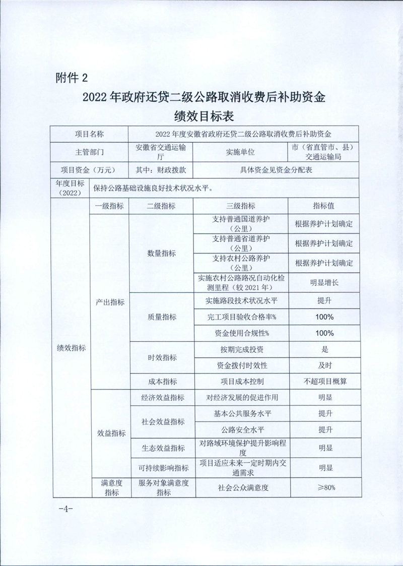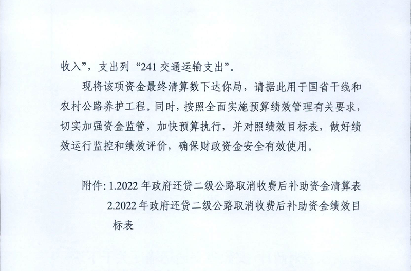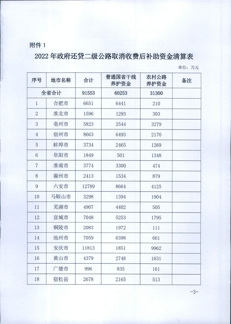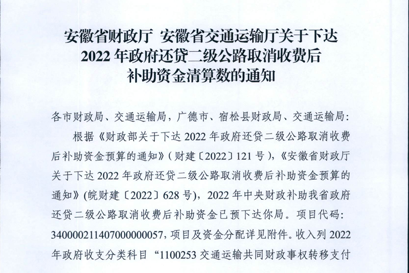 安徽省财政厅 安徽省交通运输厅关于下达2022年政府还贷二级公路取消收费后补助资金清算数的通知