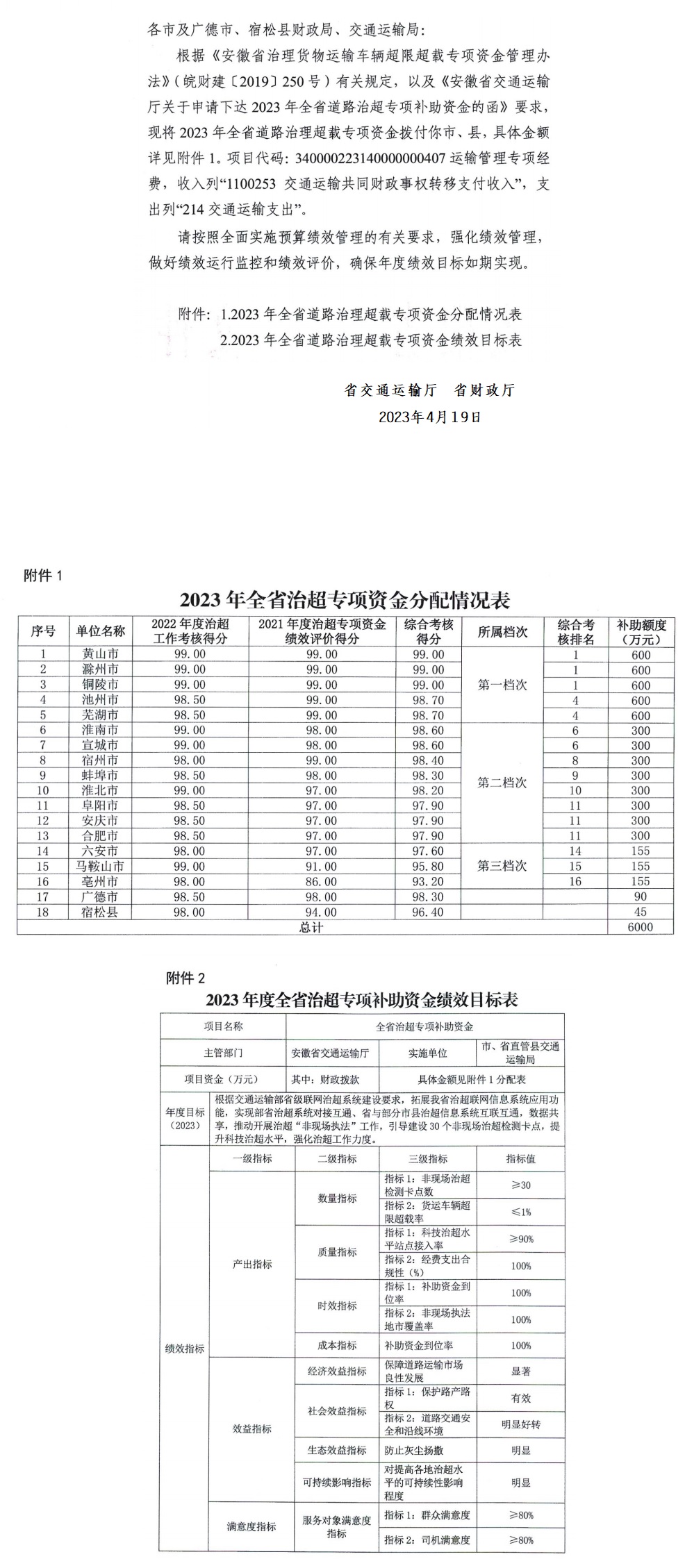 安徽省财政厅 安徽省交通运输厅关于拨付2023年全省道路治理超载专项资金的通知