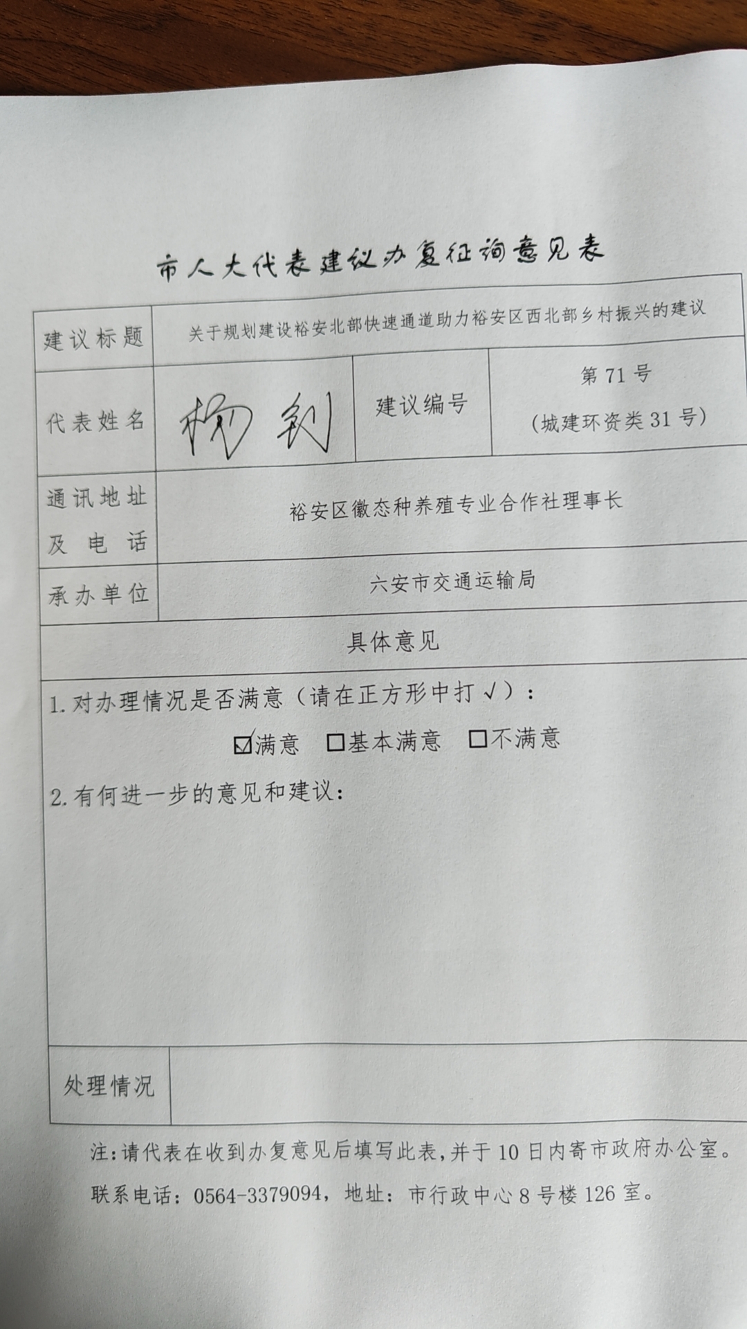 您提出的《关于规划建设裕安北部快速通道助力裕安区西北部乡村振兴的建议》收悉,现将办理情况答复如下: