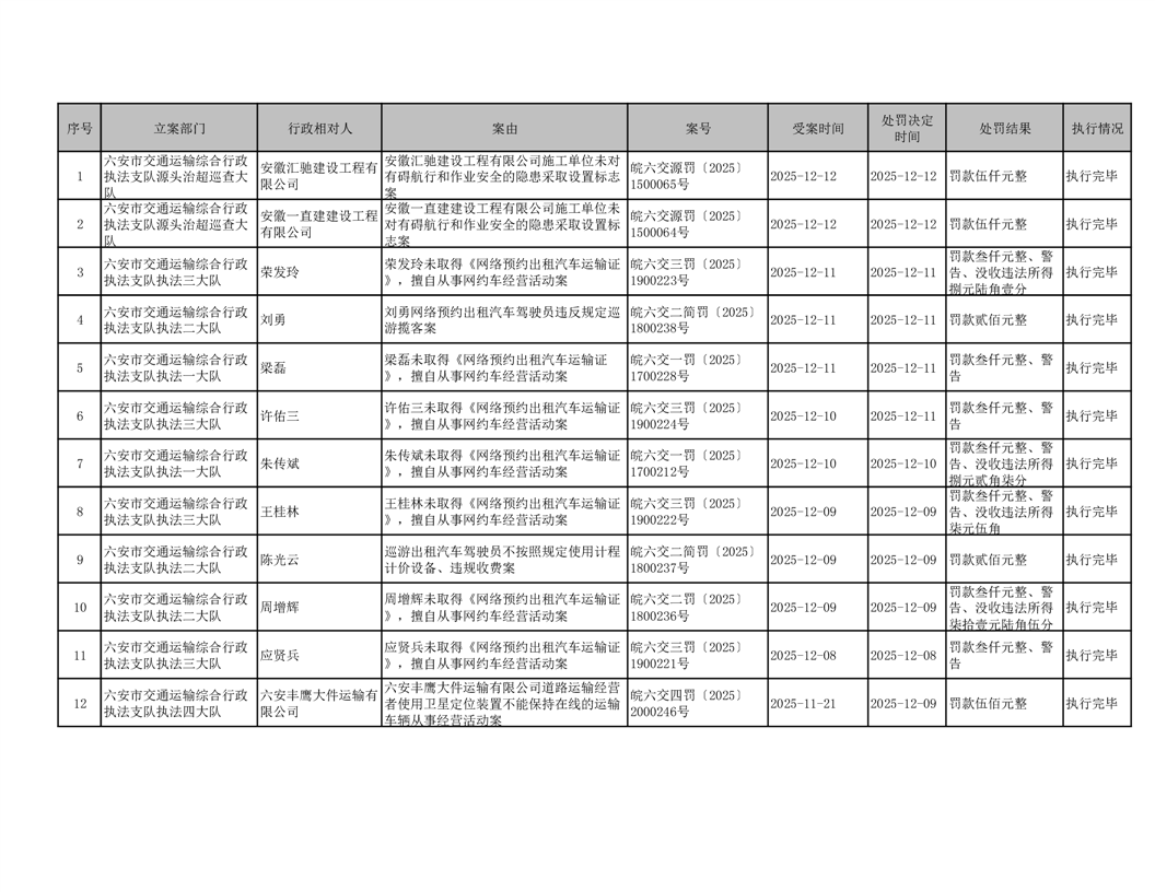 六安市交通运输局2025年12月8日至2025年12月14日行政处罚结果