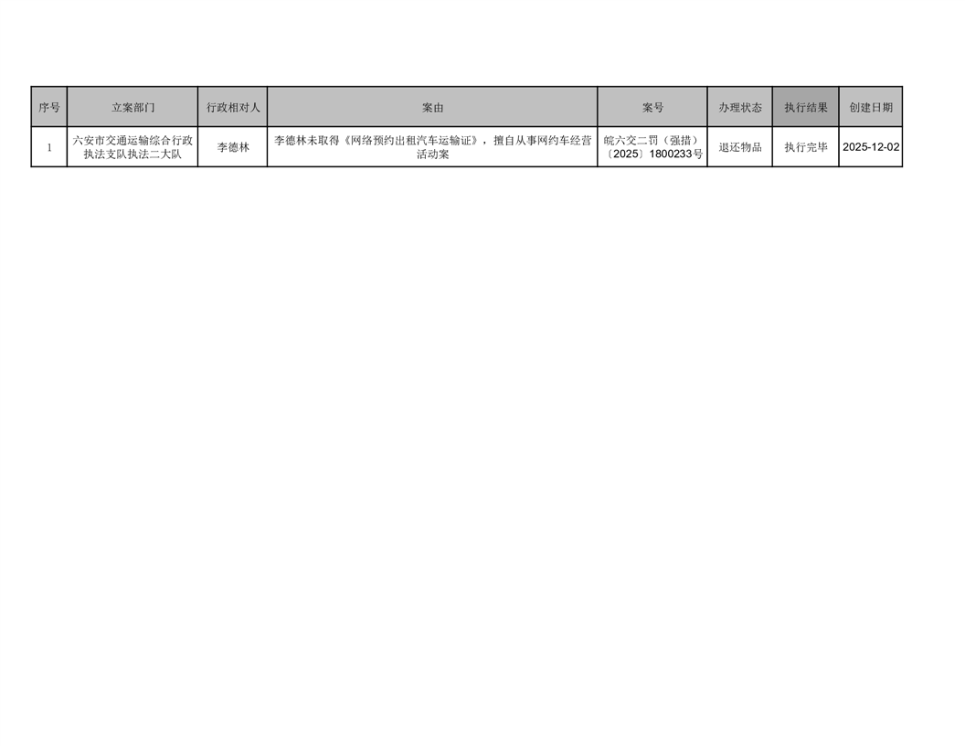 六安市交通运输局2025年12月1日至2025年12月7日行政强制结果