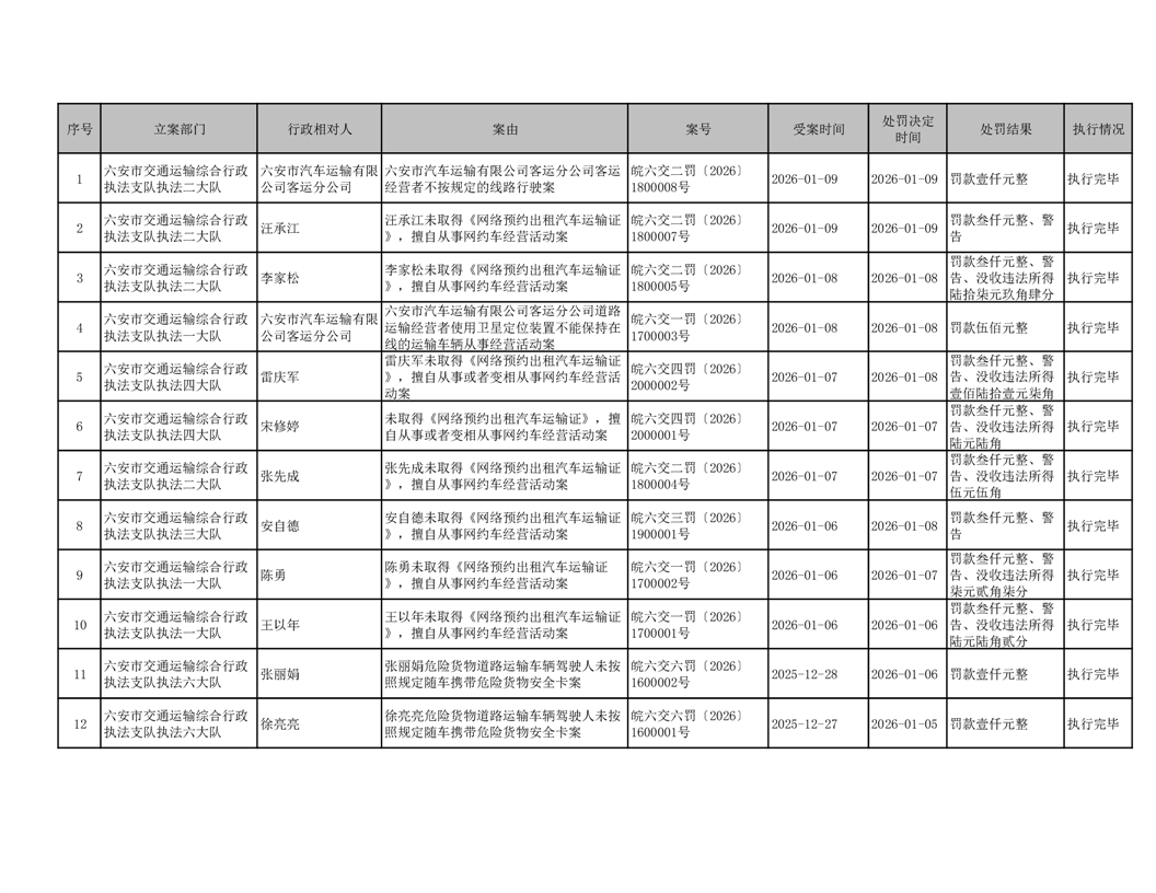 六安市交通运输局2026年1月5日至2026年1月11日行政处罚结果