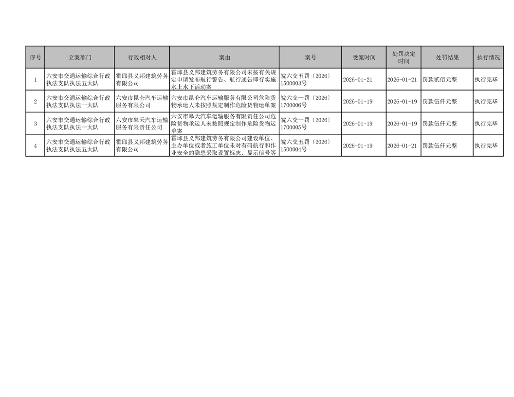 六安市交通运输局2026年1月19日至2026年1月25日行政处罚结果