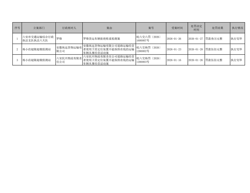 六安市交通运输局2026年1月26日至2026年2月1日行政处罚结果