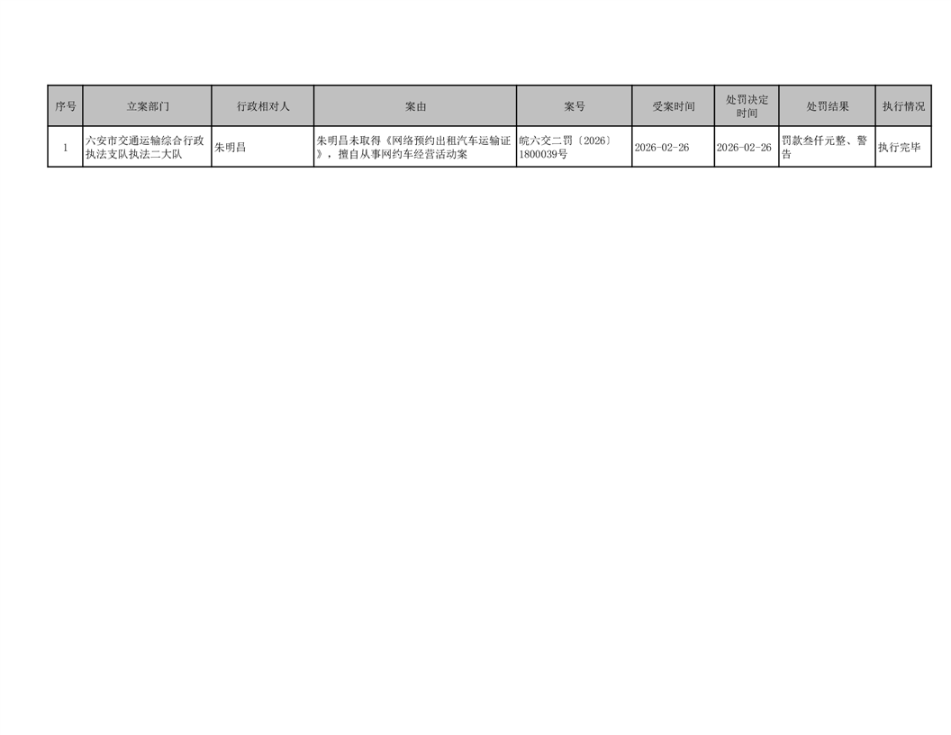 六安市交通运输局2026年2月23日至2026年3月1日行政处罚结果