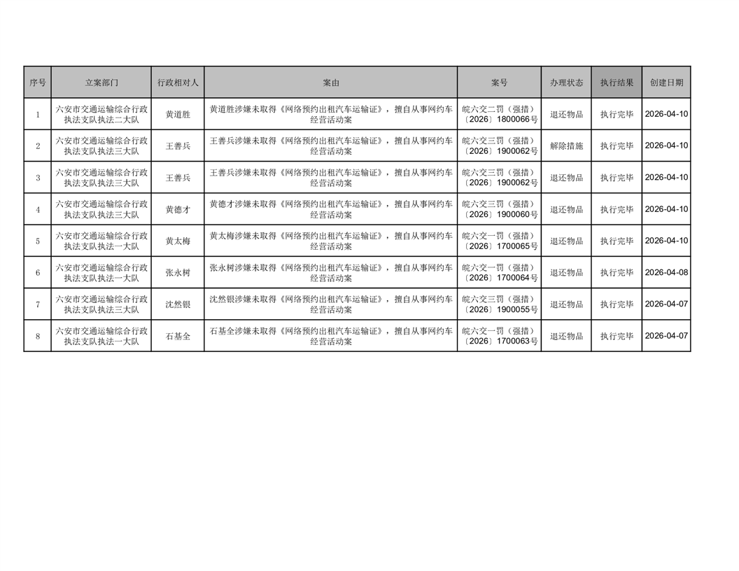 六安市交通运输局2026年4月6日至2026年4月12日行政强制结果