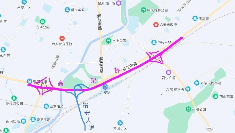 G312快速路二期,磨子潭路至梅山南路距离短,但有3条主要交通大道交叉(磨子潭路、裕安大道、梅山南路)建议全程高架桥,互通式立交设计