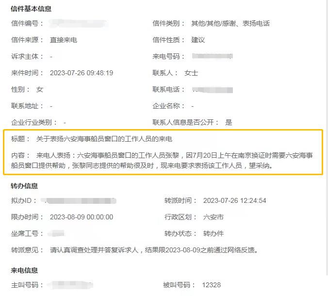 “因7月20日上午在南京换证遇到困难,六安海事船员窗口工作人员张黎提供的帮助很及时,现来电要求表扬该工作人员。”近日,市政务服务中心海事办事大厅收到一封“12328”热线电话转派的“表扬”工单,船员江女士在热线中对六安海事工作人员张黎为其解决“急事”表示感谢。