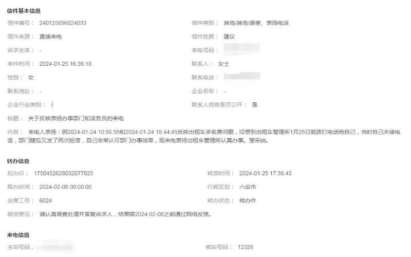 1月25日,六安市12328热线接到一位女士电话,对市出租车管理所工作人员表示感谢。