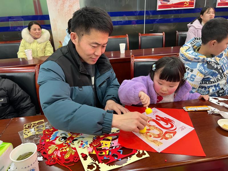 “要先看好样品,思考从哪开始、怎样搭配再动手”、“不要着急慢慢来”“龙年手工出炉了,祝你龙年大吉”拓年画、做手工环节,职工和子女默契配合、积极互动,你一言我一语充满了欢声笑语。