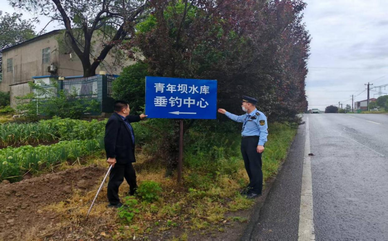 4月25日,市交通执法支队一大队执法人员在S440线椿树段公路用地范围内发现树着一块小型垂钓中心指向牌,经走访调查,村民蒋大爷为方便自家垂钓园宣传,擅自在公路用地范围内设置小型广告牌,该行为违反《公路安全保护条例》中不得随意在公路用地范围内设置非公路标牌有关规定。