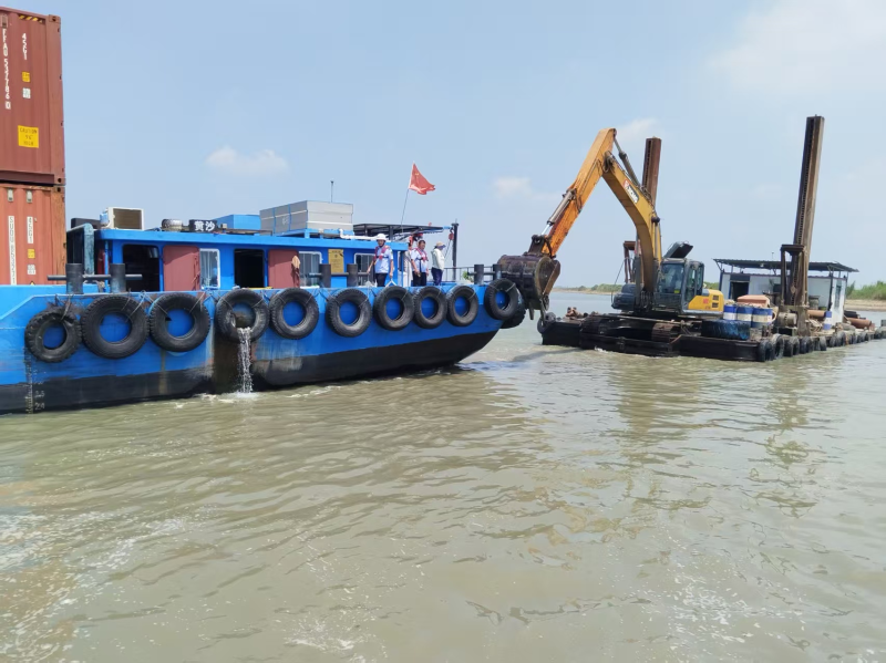 航道水位低、船舶易搁浅,险情就是命令,为高效救助搁浅船舶,霍邱县地方海事处启动应急预案,组织水上应急保障队伍,紧急调集水上挖机进驻浅滩水域。烈日炎炎,淮河岸边地表温度持续攀升至40℃以上,海事工作人员顶着烈日暴晒,踩着滚烫甲板,全程坚守作业现场,紧盯淤堵点位指导精准作业和水深探测,确保淤堵航道水深满足通航需求。