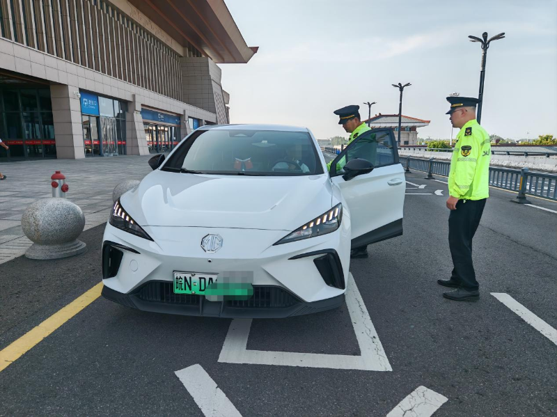 近日,舒城县交通执法大队执法人员在舒城县高铁东站落客平台巡查发现,绿皖*******小型轿车正在下客,执法人员上前出示执法证件表明身份后,对该车进行执法检查。