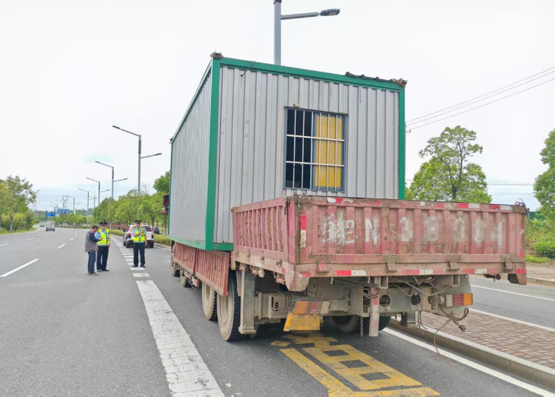 9月17日上午,六安市交通执法支队一大队执法人员在执行日常巡查时敏锐地发现,一辆运输移动板房的黄皖重型四轴货车存在超限运输,随即引导至安全区域进行检查。