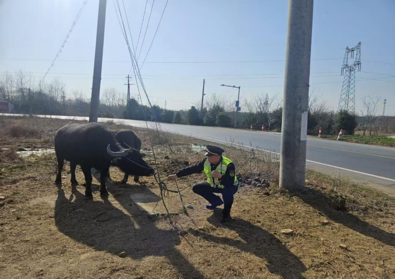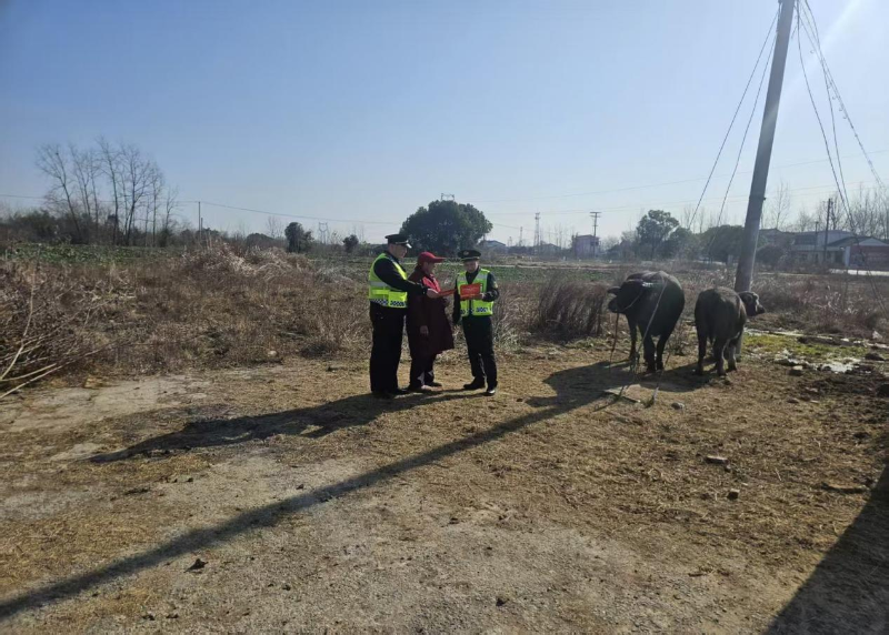 队员们一边协助王大妈将耕牛牵至远离公路的安全地带,重新系牢缰绳,一边耐心宣讲《公路安全保护条例》:“公路及公路周边区域严禁放养牲畜,一旦发生事故,不仅会危及他人安全,也会给您自身带来风险,还需承担相应法律责任。”