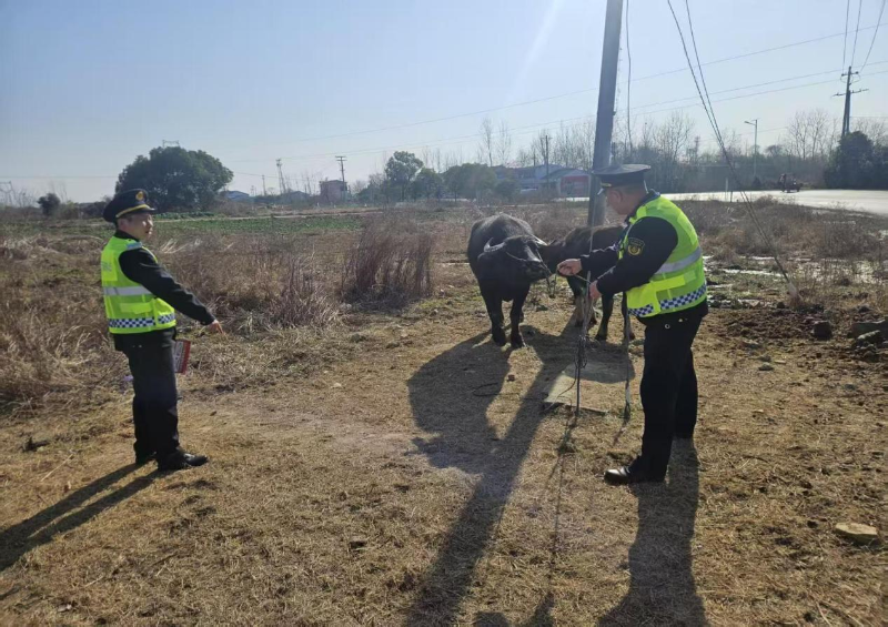 ——六安市交通执法一大队清晨及时化解耕牛上路风险