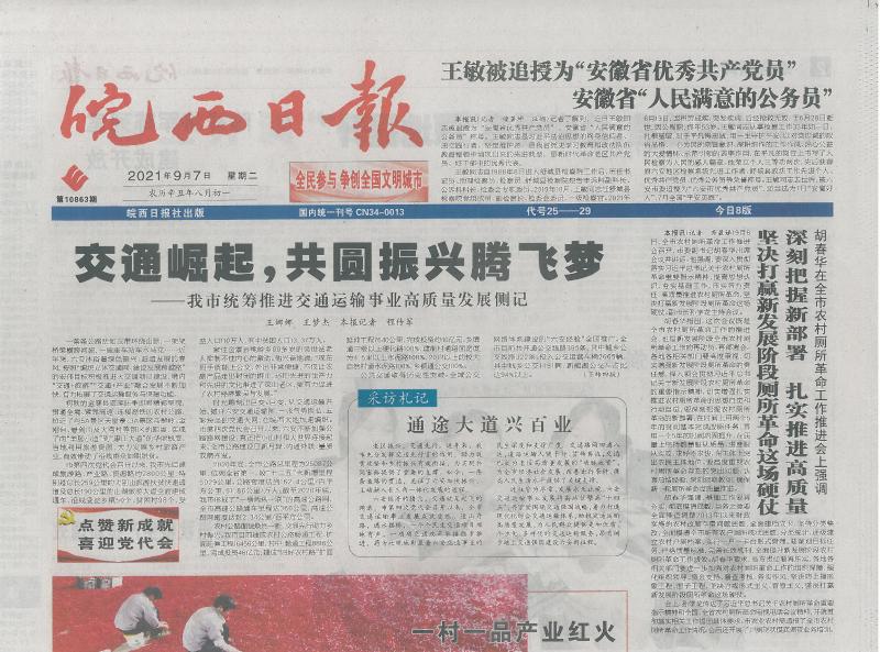 2021年9月7日,《皖西日报》在头版头条位置刊登《交通崛起,共圆振兴腾飞梦》一文,介绍我市交通运输事业高质量发展历程,引起社会各界广泛关注,文章被多家媒体转载。