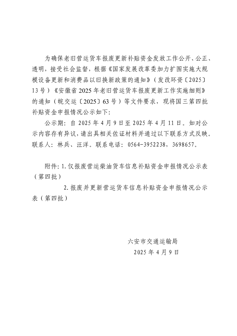 关于2025年六安市老旧营运货车报废更新补贴资金申报情况的公示(国三第四批)