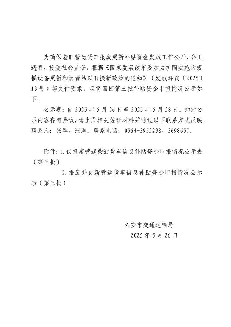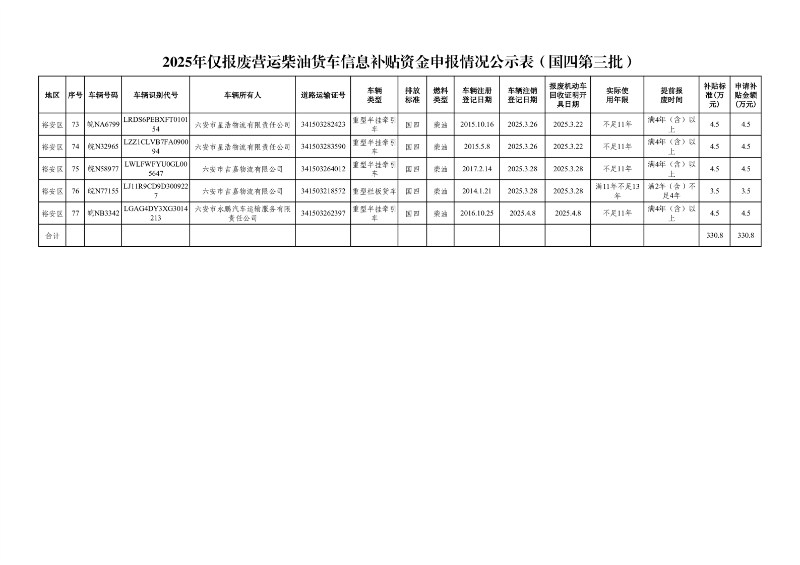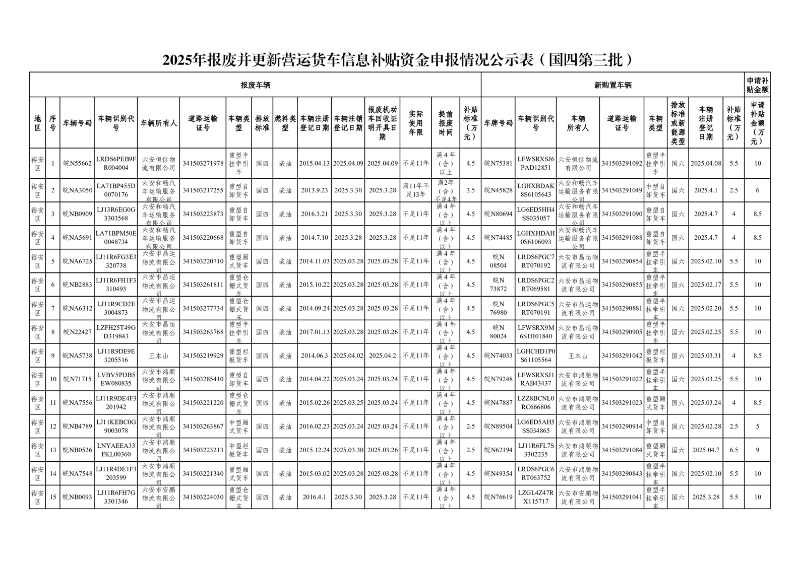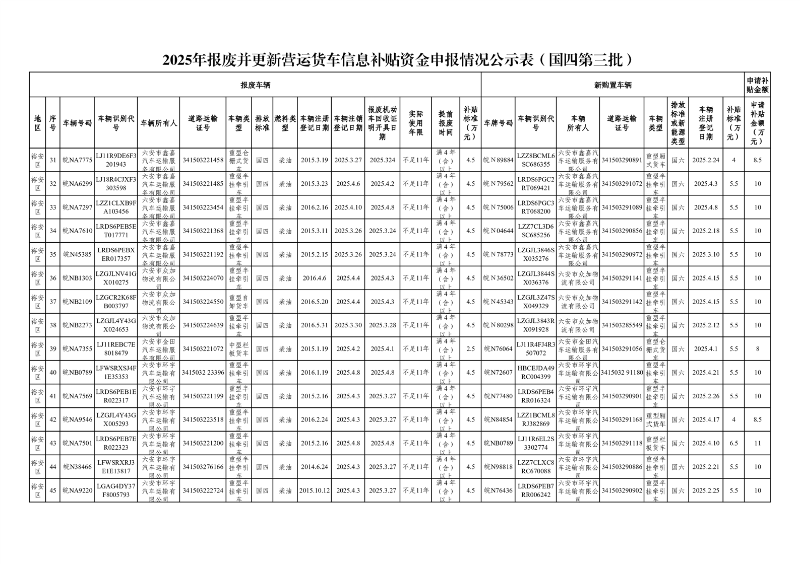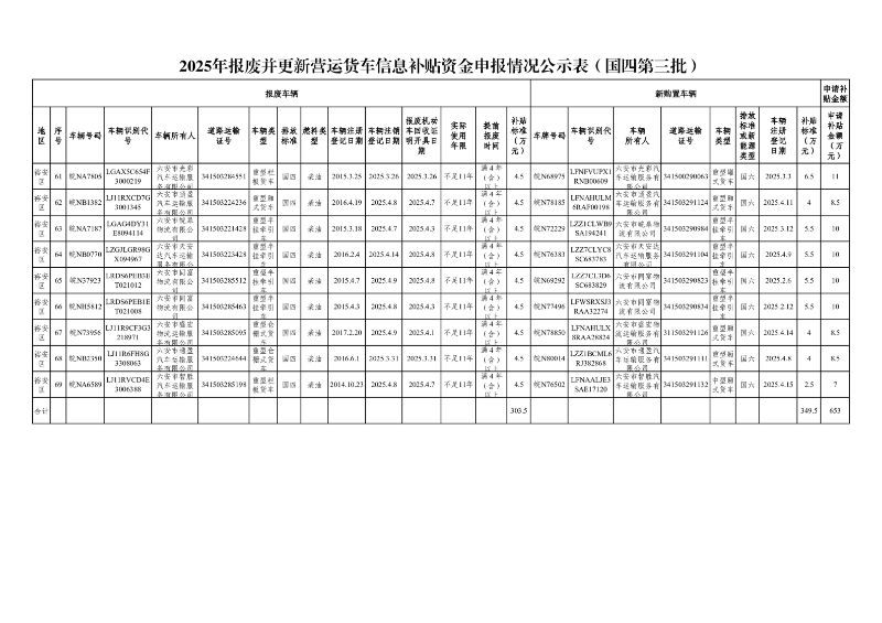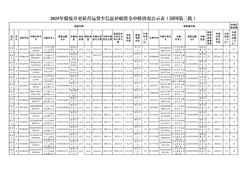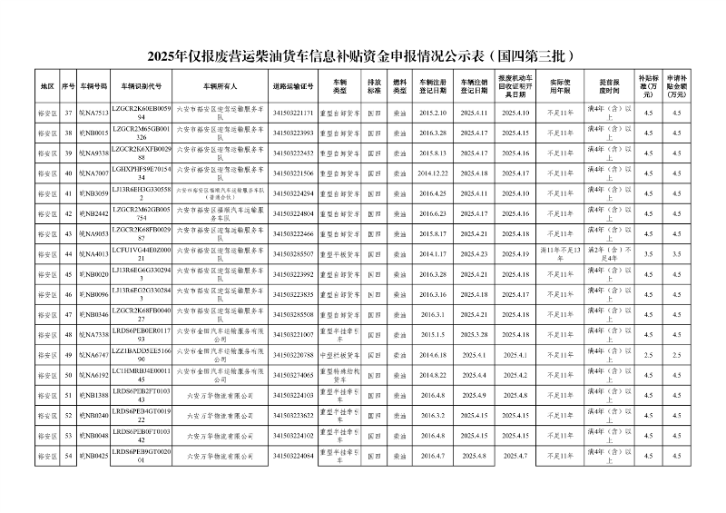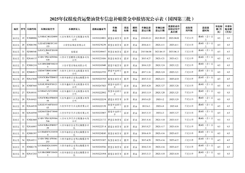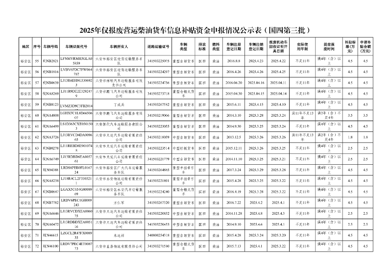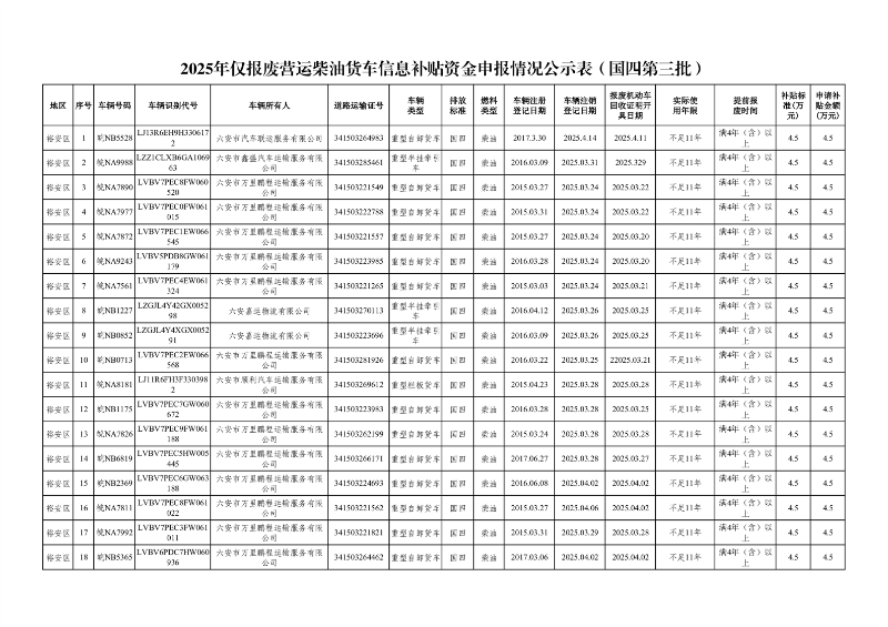 关于2025年六安市老旧营运货车报废更新补贴资金申报情况的公示(国四第三批)