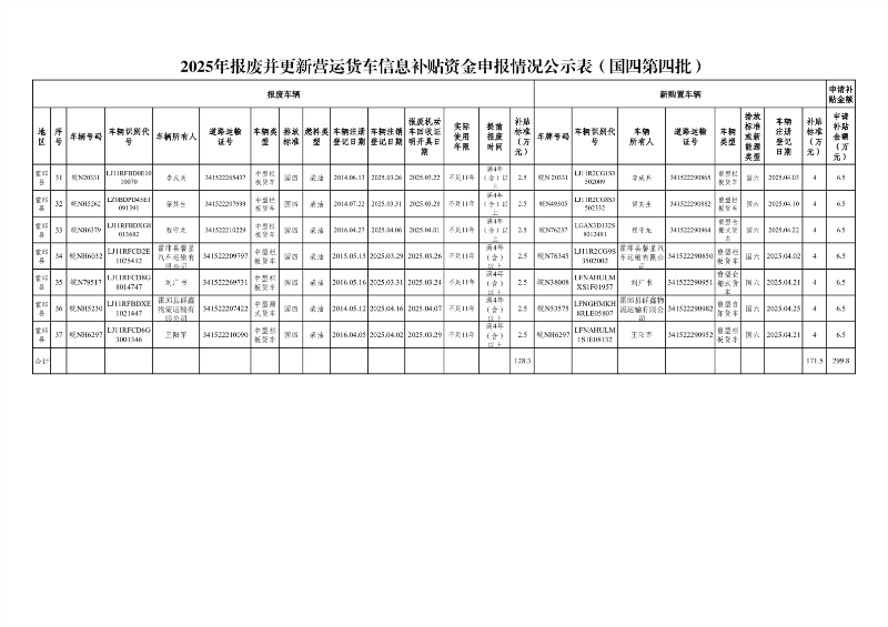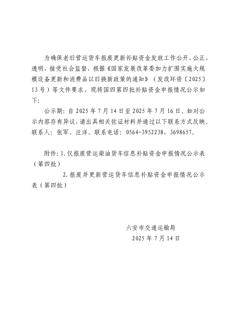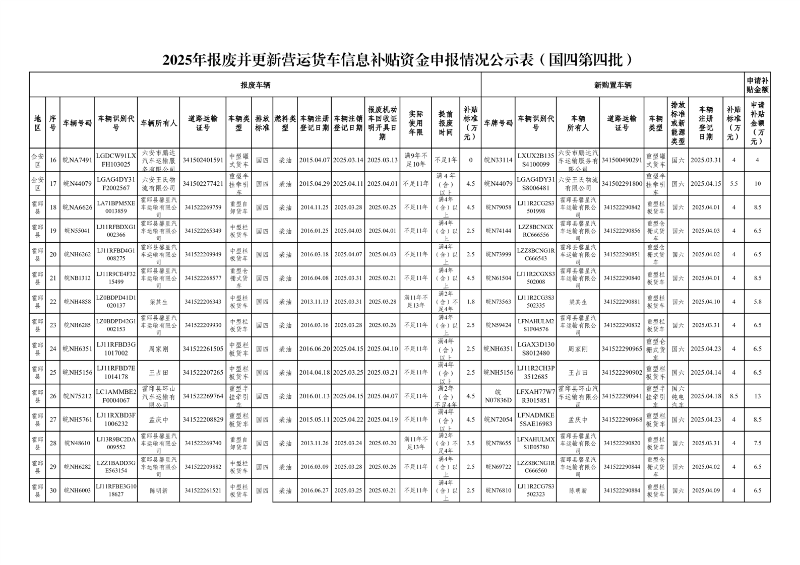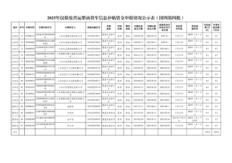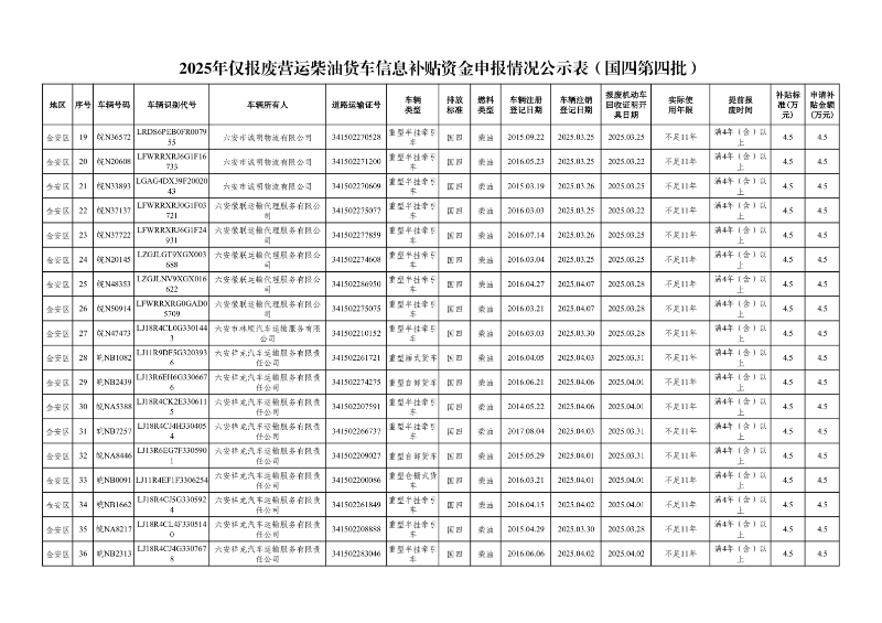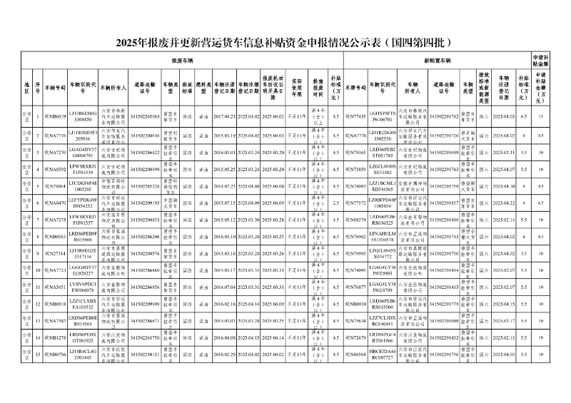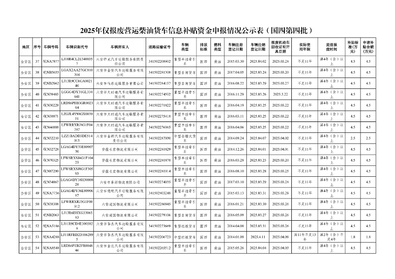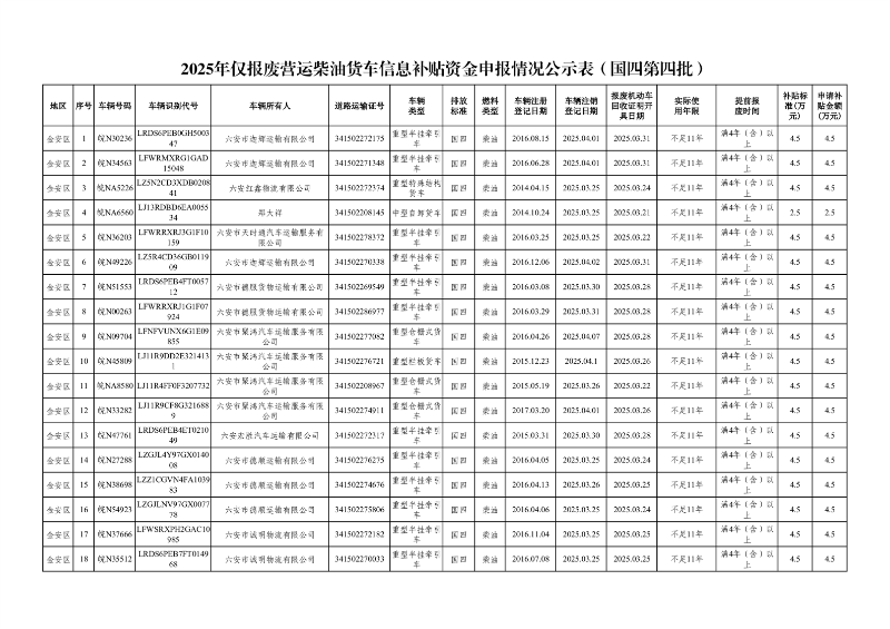 关于2025年六安市老旧营运货车报废更新补贴资金申报情况的公示(国四第四批)