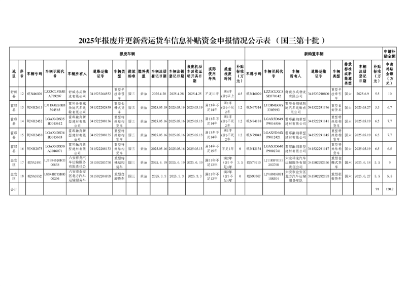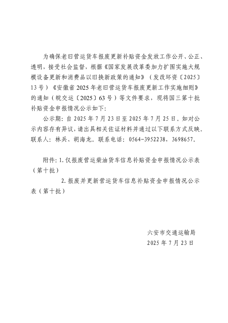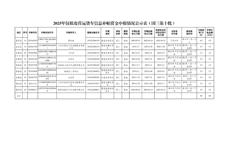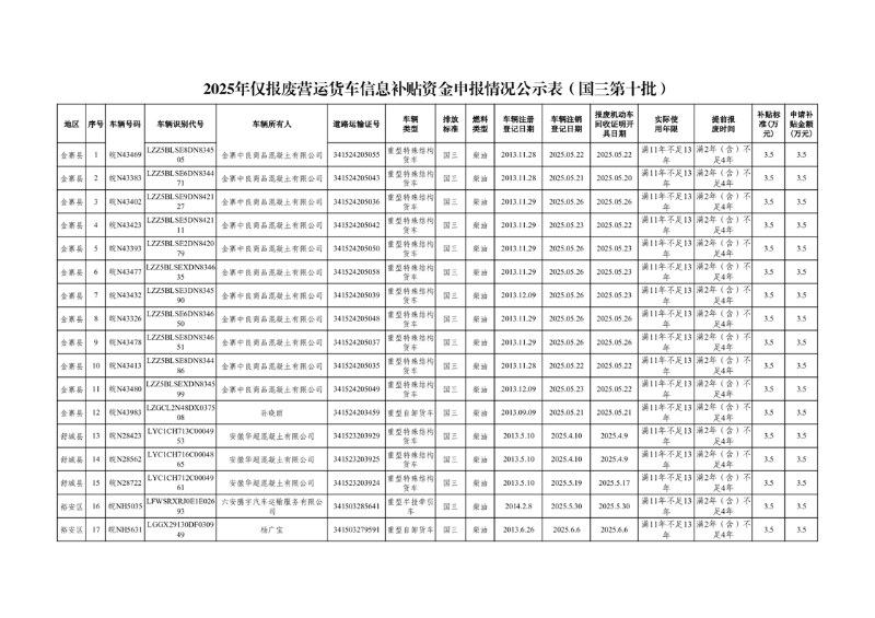 关于2025年六安市老旧营运货车报废更新补贴资金申报情况的公示(国三第十批)
