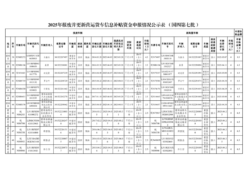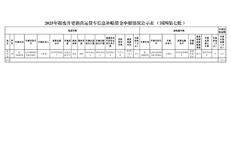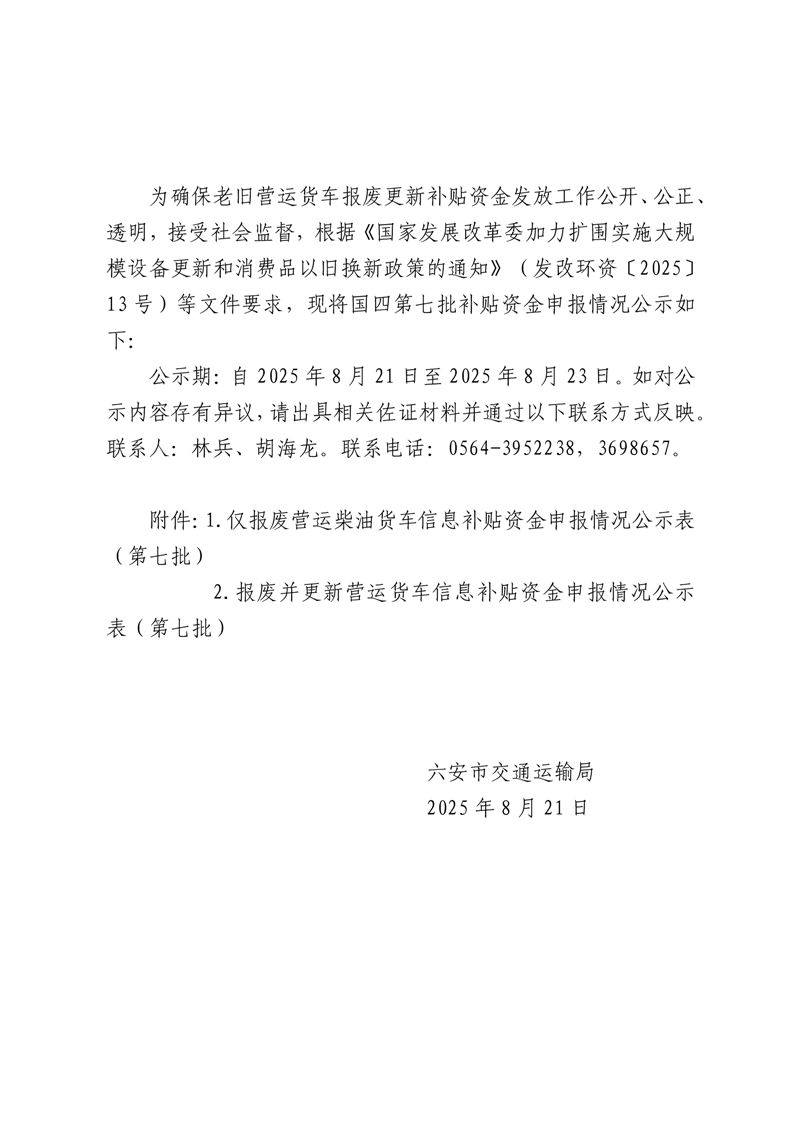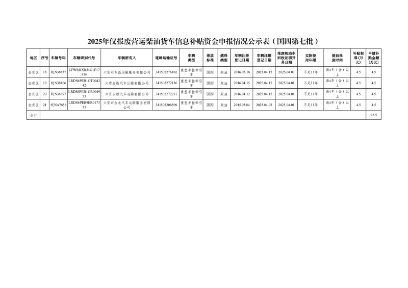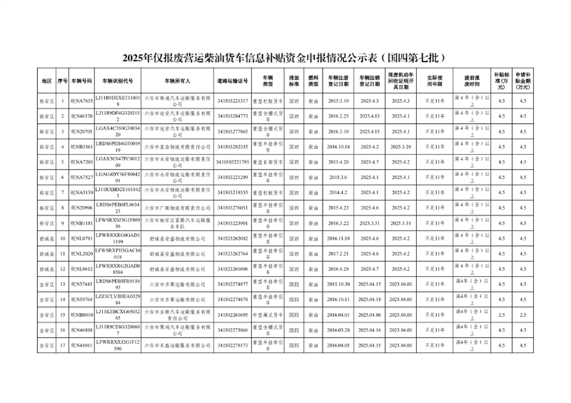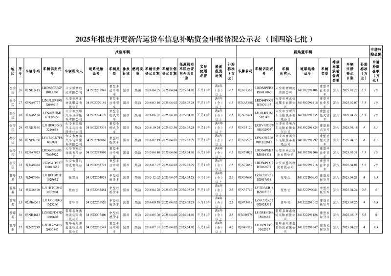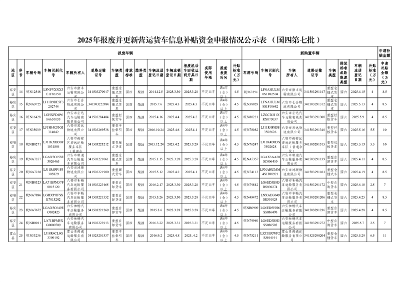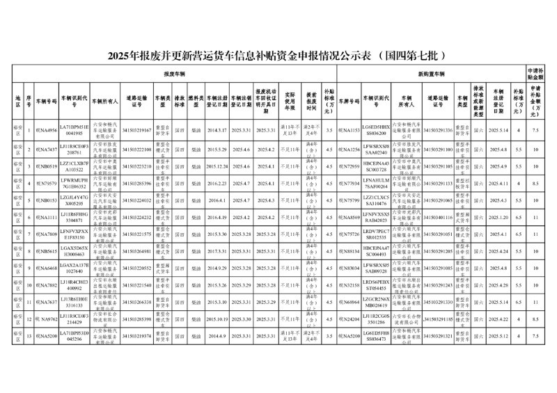 关于2025年六安市老旧营运货车报废更新补贴资金申报情况的公示(国四第七批)
