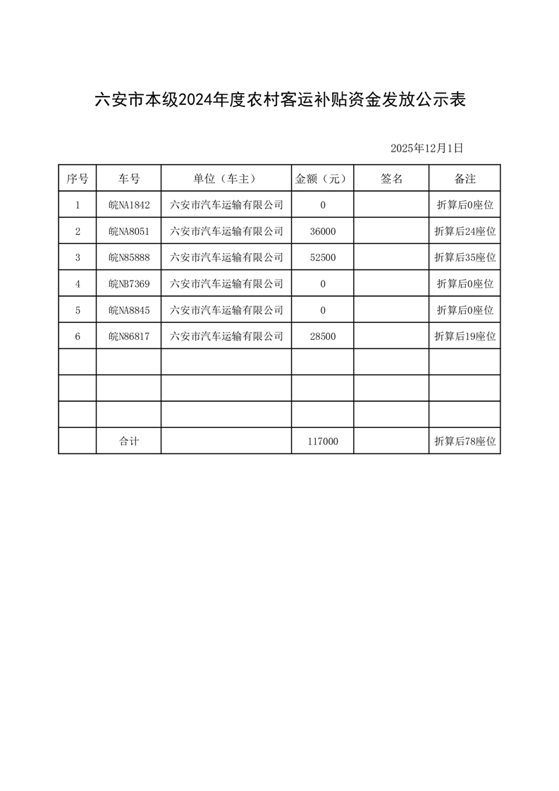 根据六安市道路运输管理处《六安市2025年市本级农村客运补贴资金、城市交通发展奖励资金发放实施方案》(六运综〔2025〕70号)的通知,现将《六安市本级2024年度农村客运补贴资金发放登记表》、《六安城区2024年度出租汽车城市交通发展奖励资金发放信息表》、《六安城区2024年度新能源出租汽车推广补贴信息表》和《六安城区2024年度新能源出租汽车一次性补贴信息表》进行公示。公示时间从2025年12月2日至12月8日(公示期共七天)。公示期间如有异议,请及时反馈到市运管处。