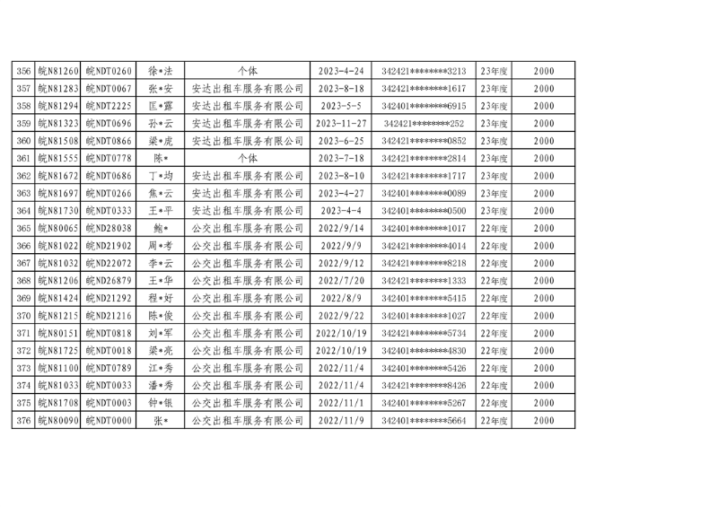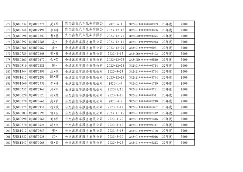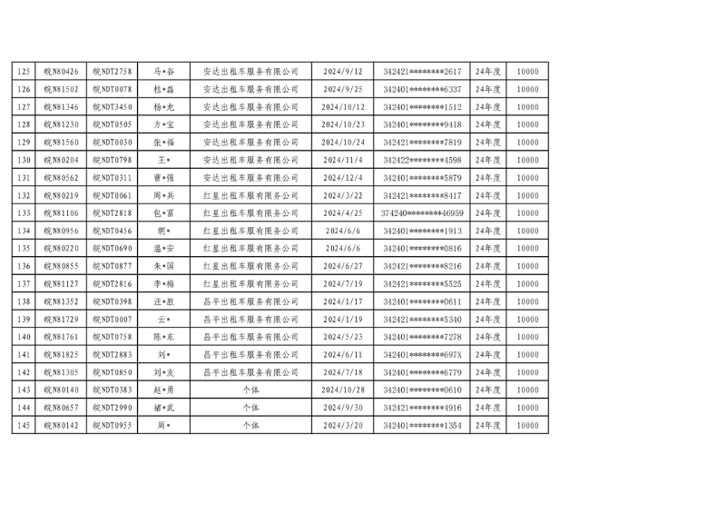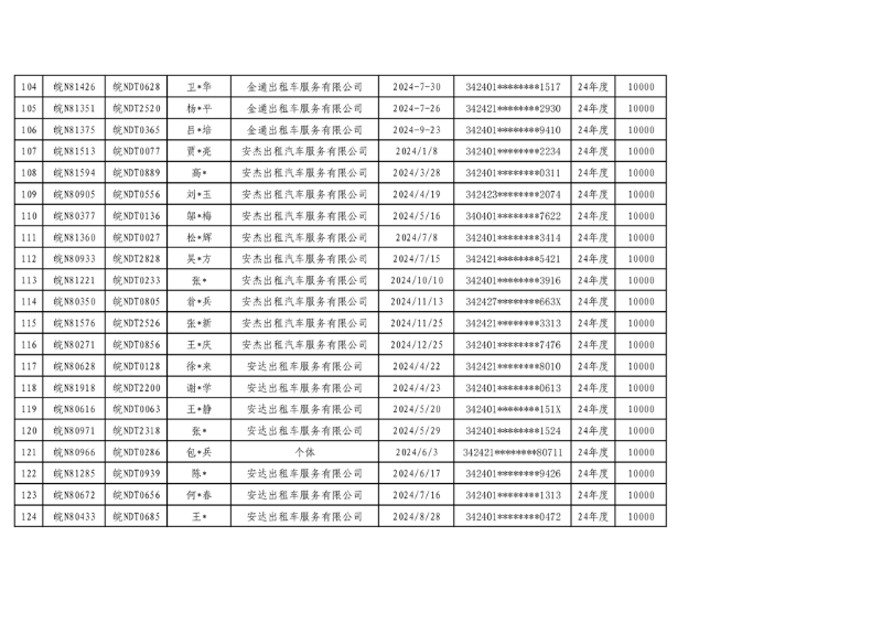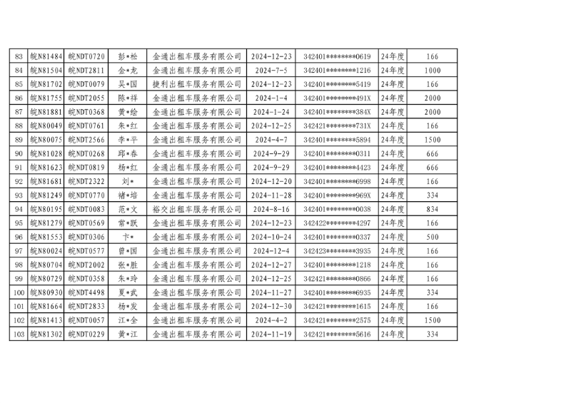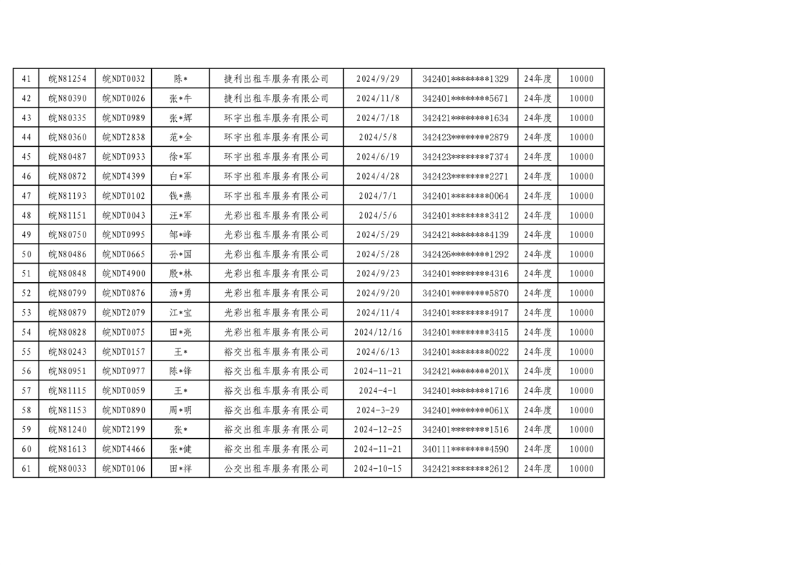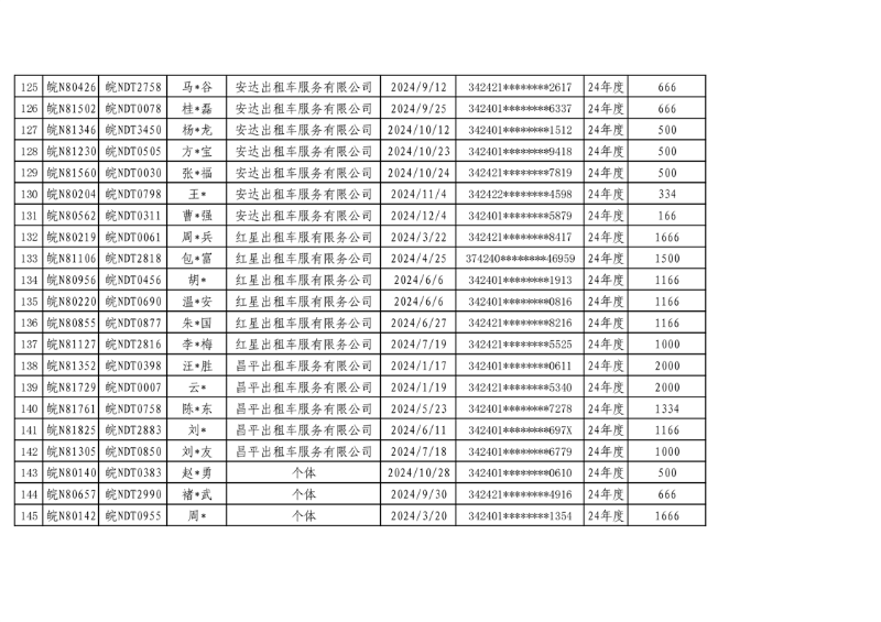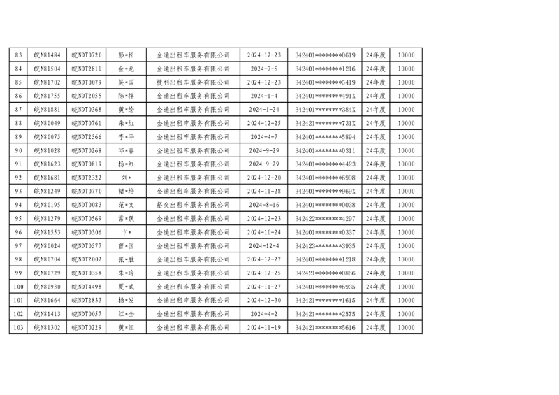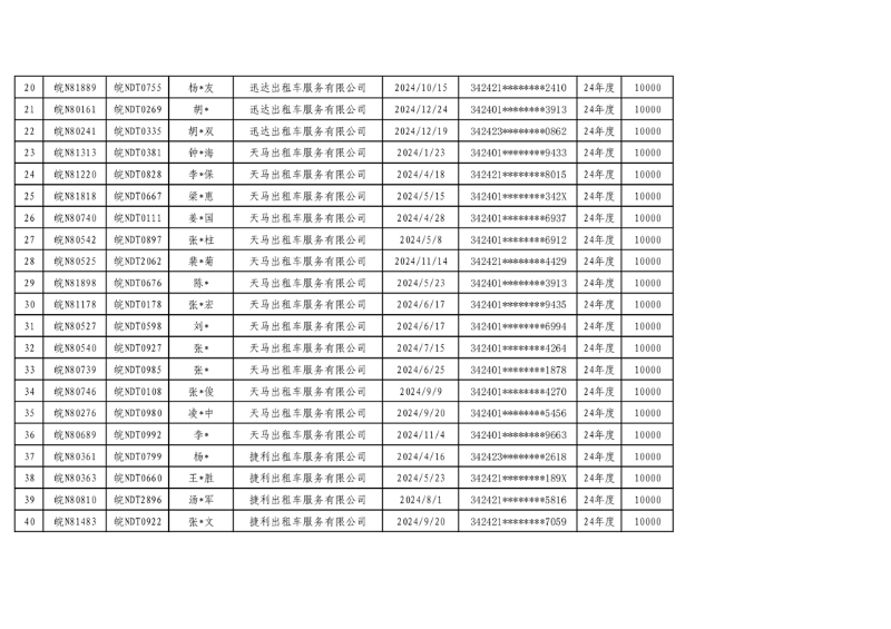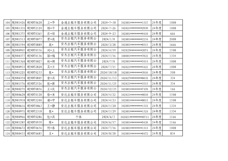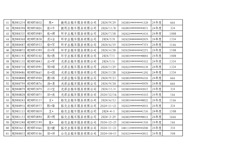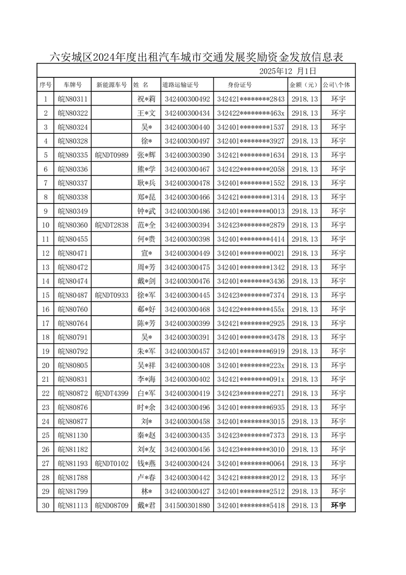 《六安城区2024年度出租汽车城市交通发展奖励资金发放信息表》