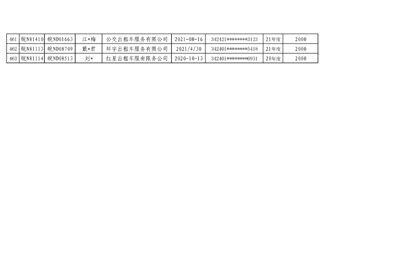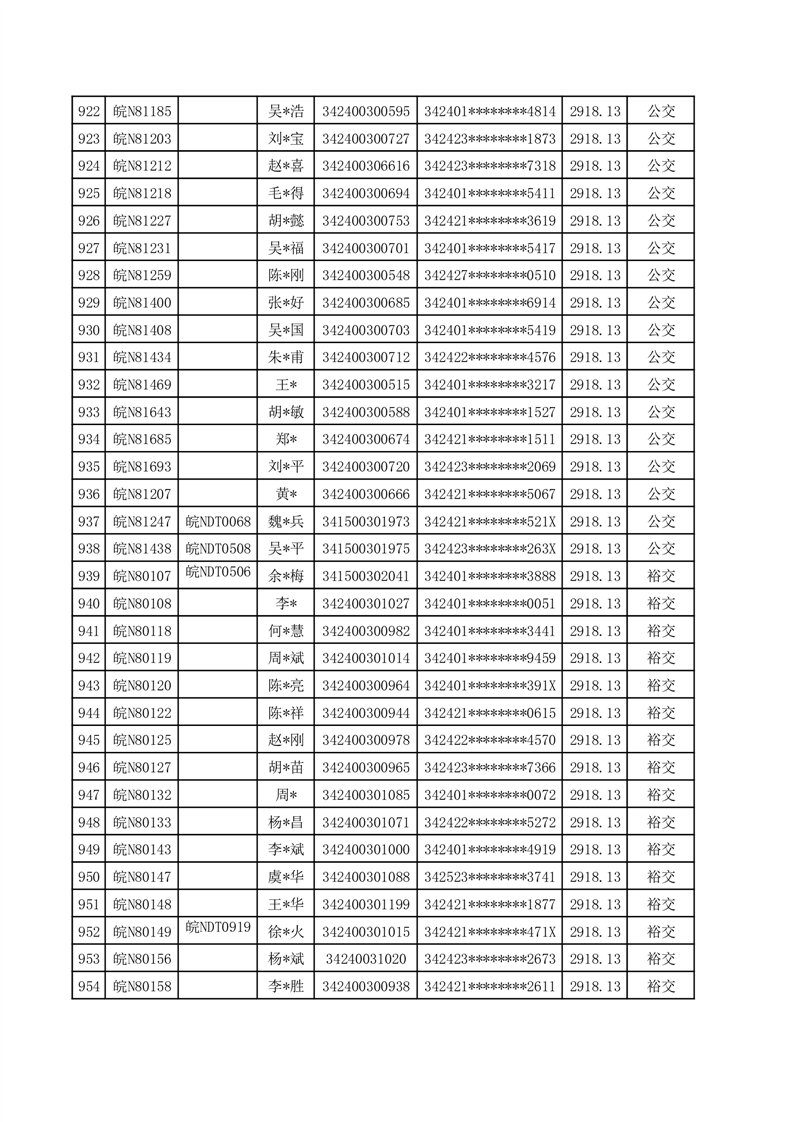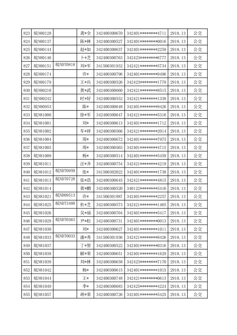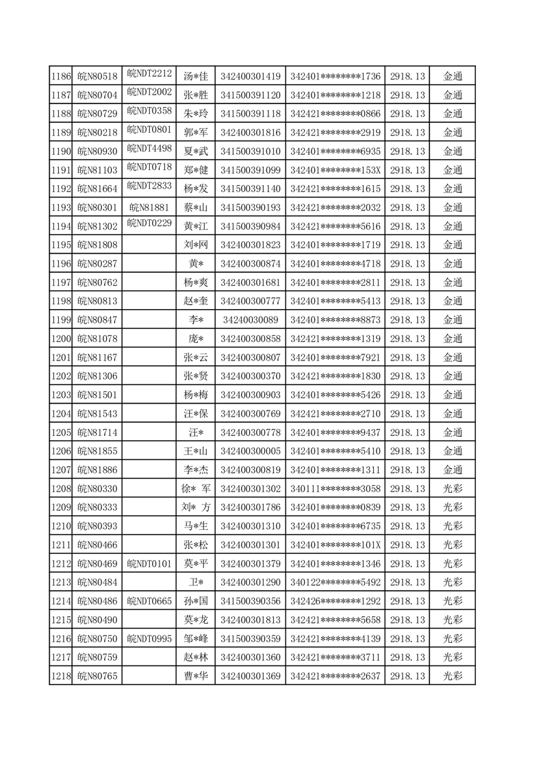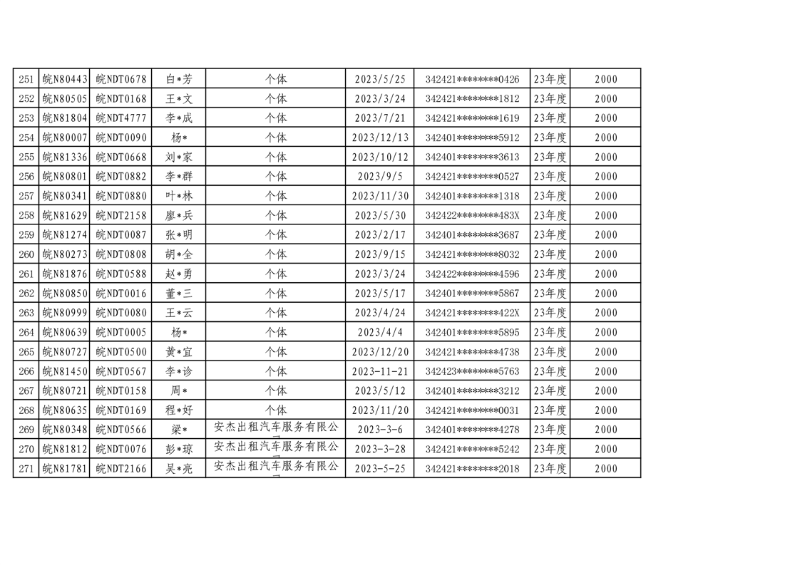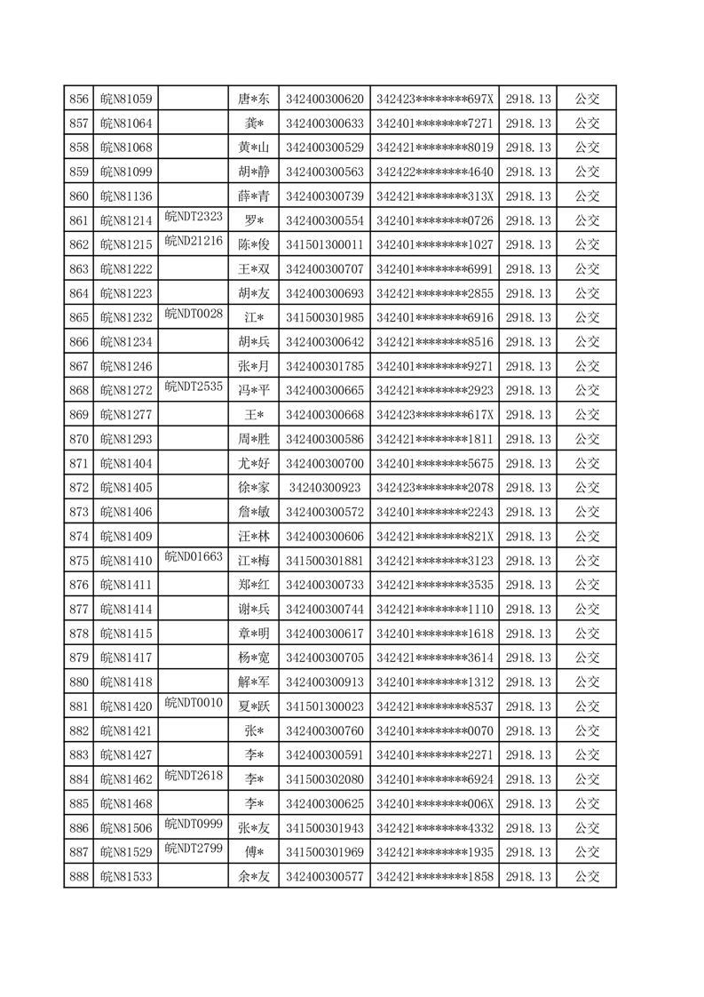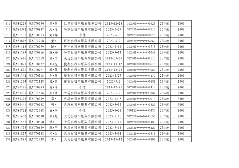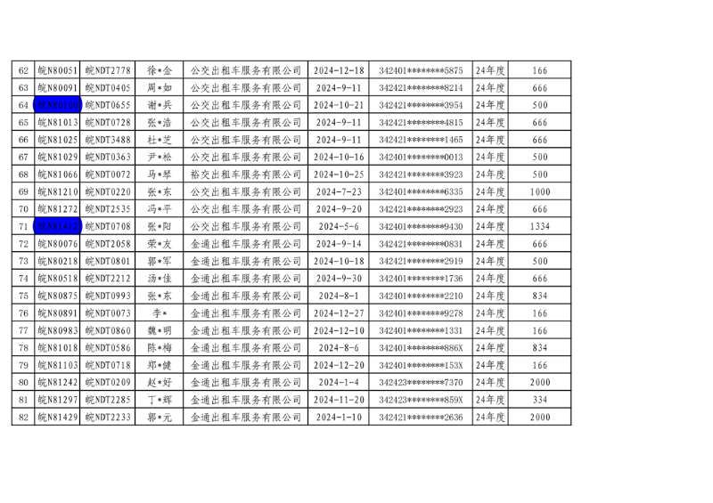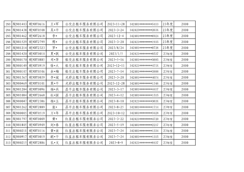 《六安城区2024年度出租汽车城市交通发展奖励资金发放信息表》