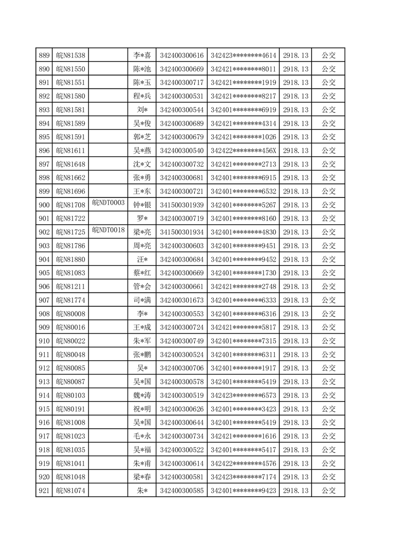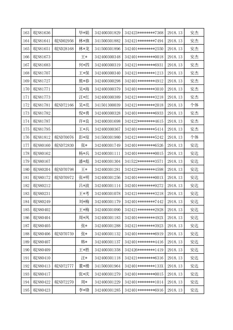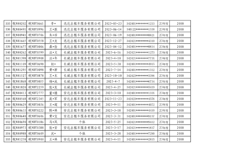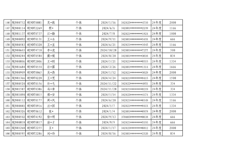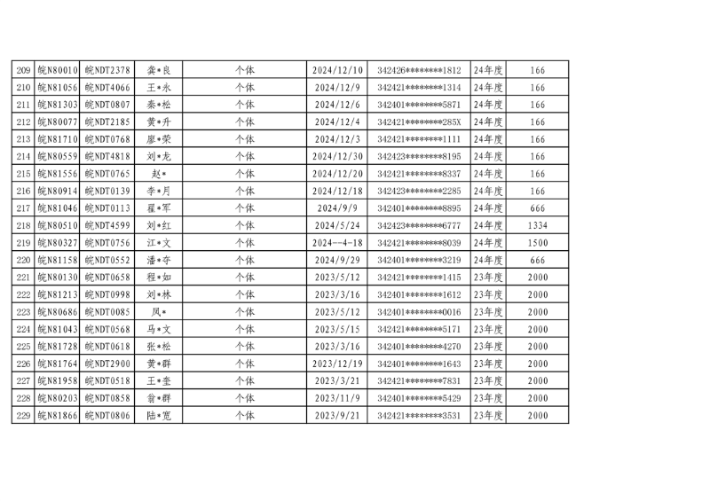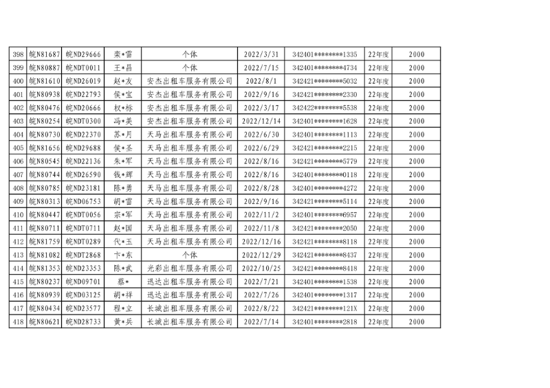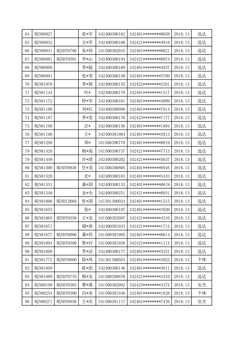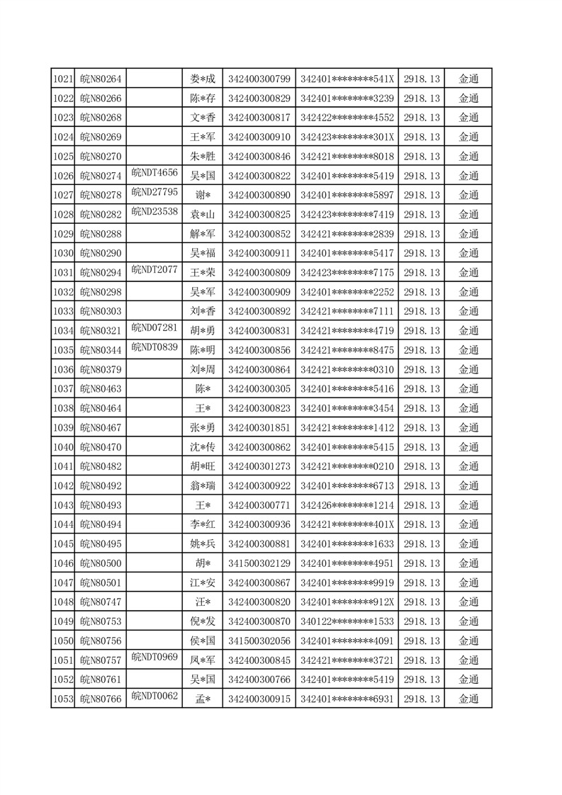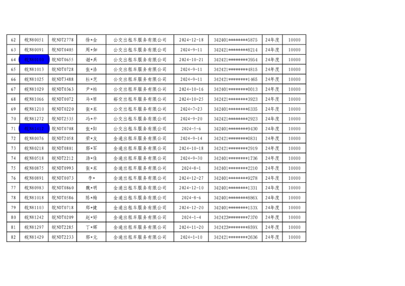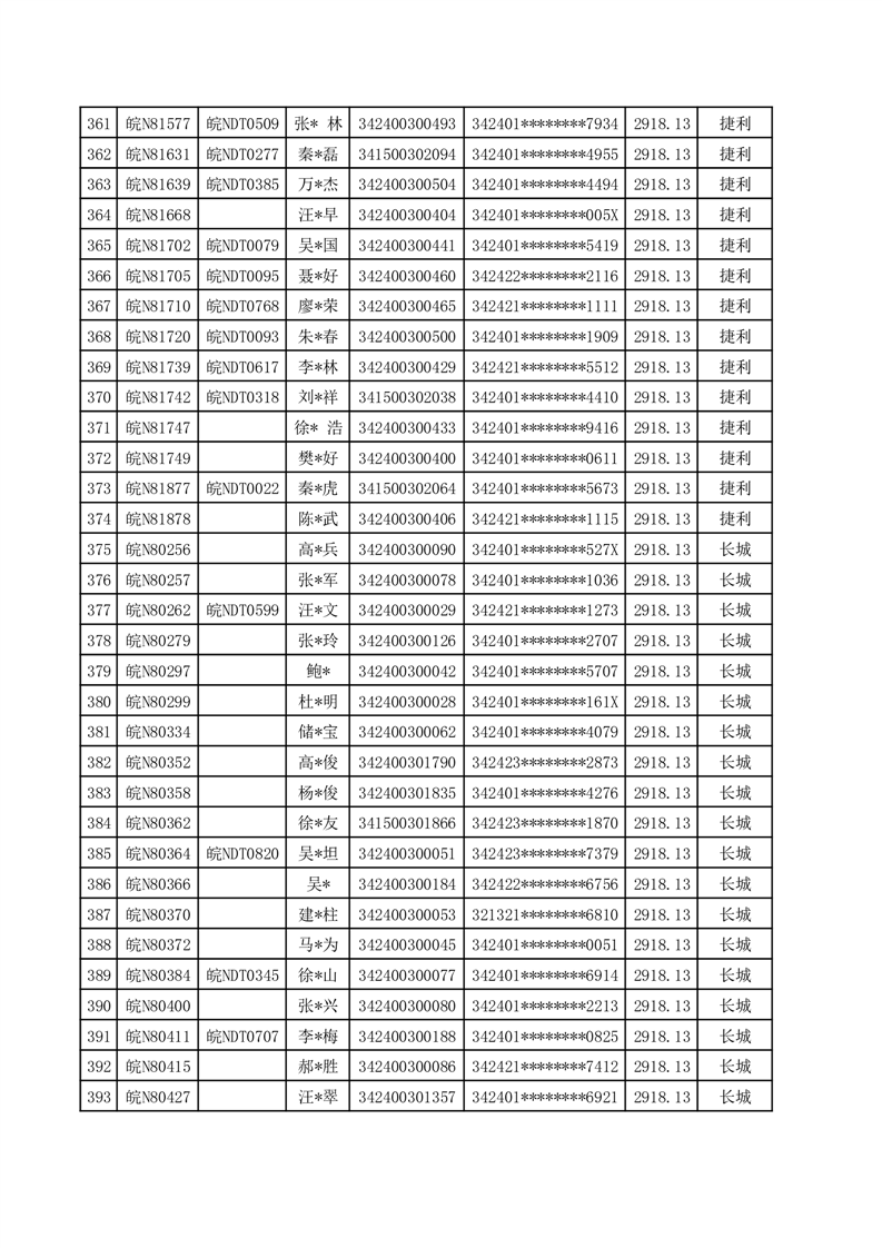 《六安城区2024年度出租汽车城市交通发展奖励资金发放信息表》