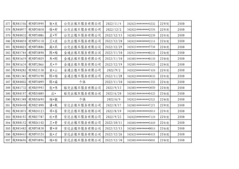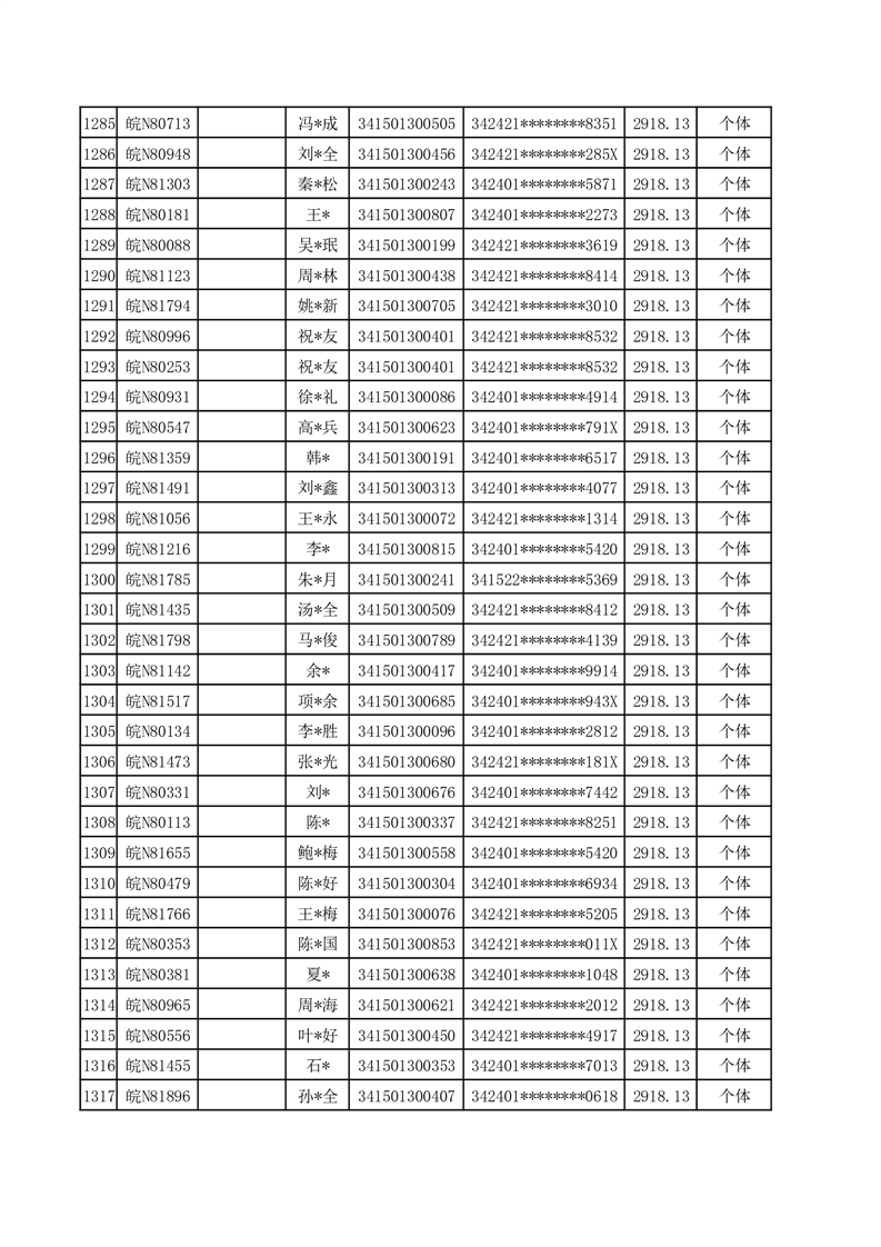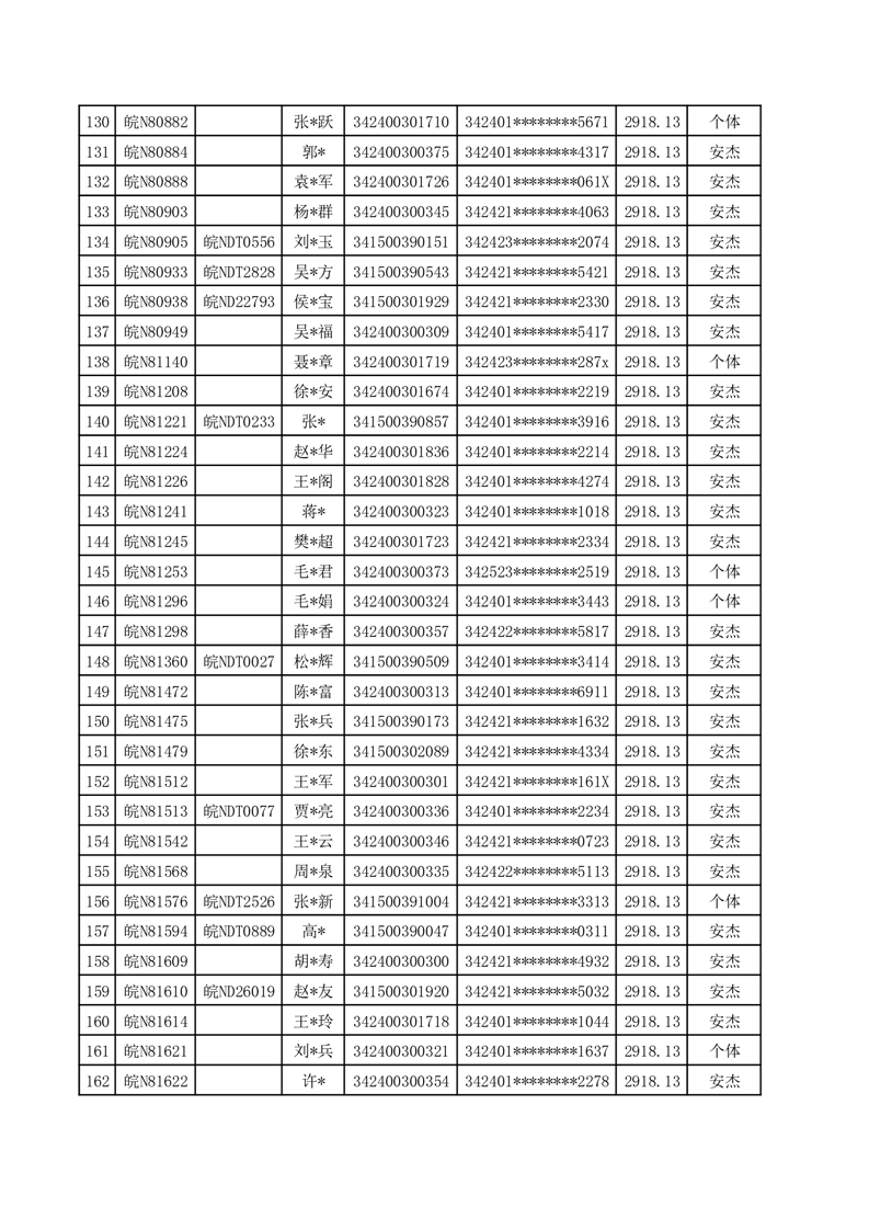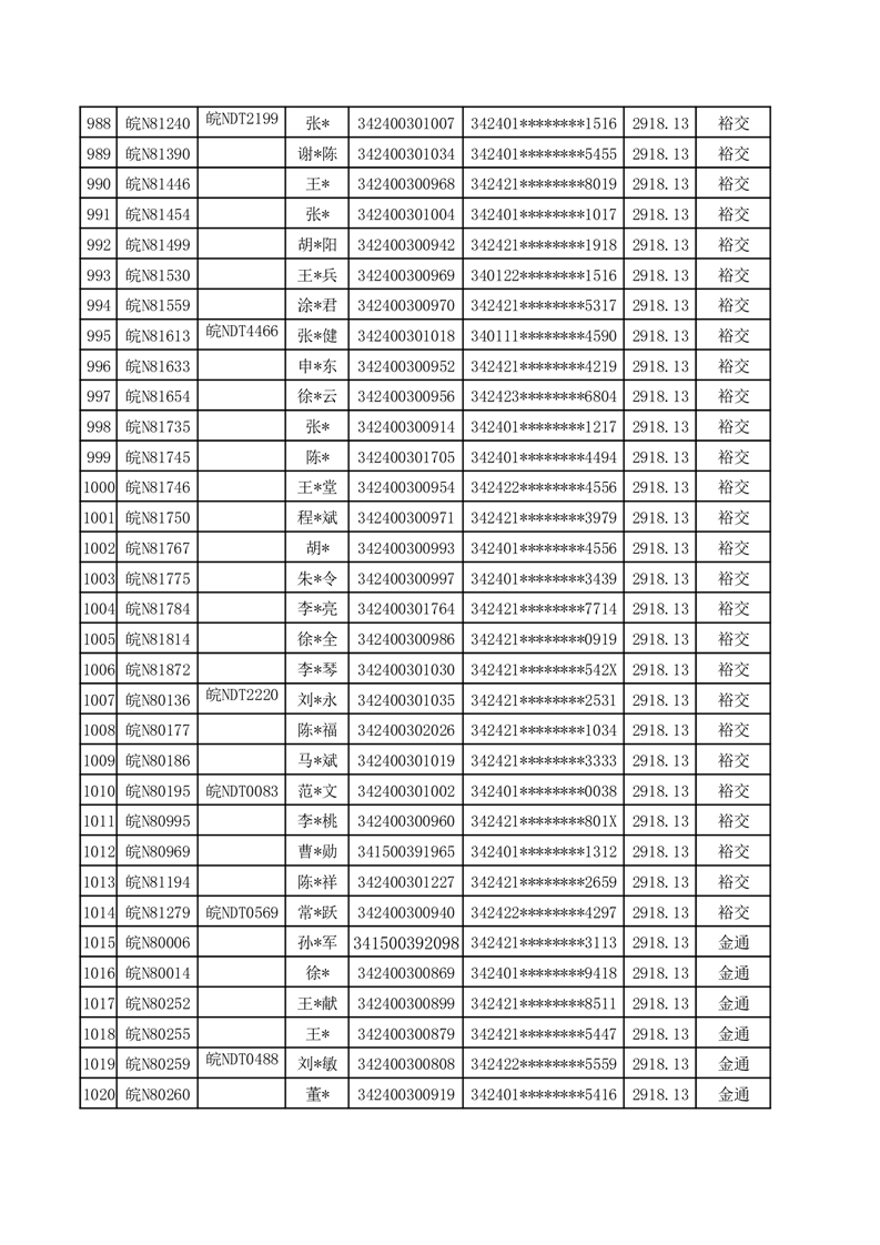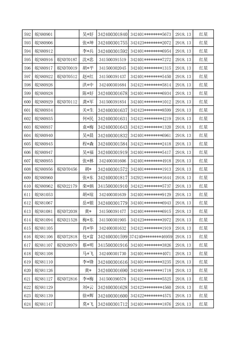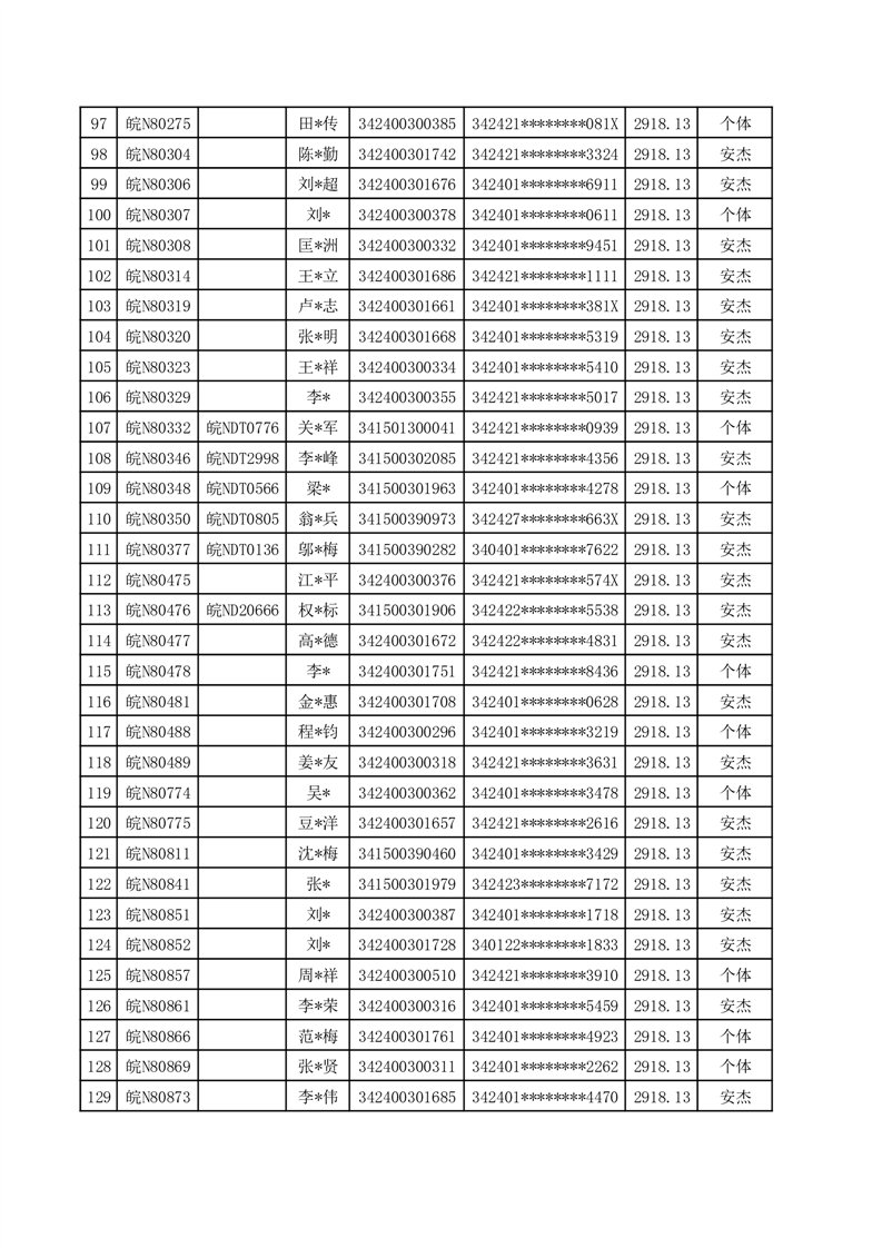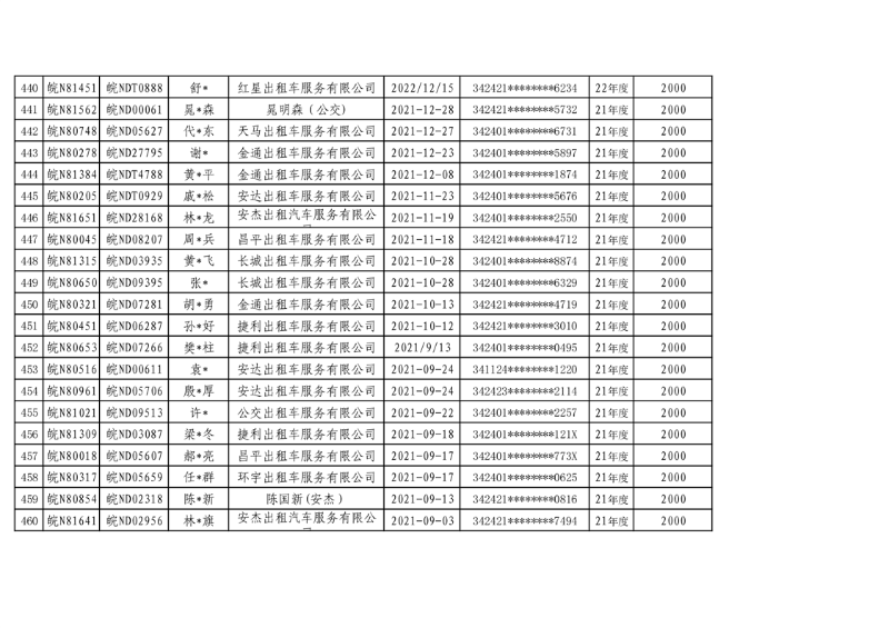 《六安城区2024年度出租汽车城市交通发展奖励资金发放信息表》