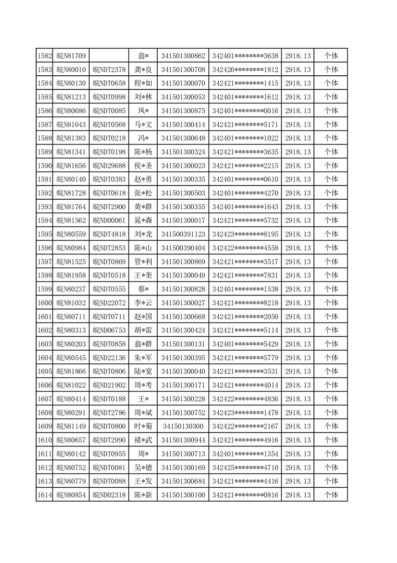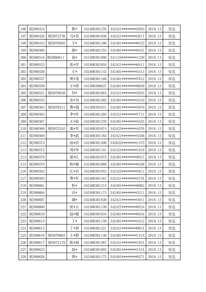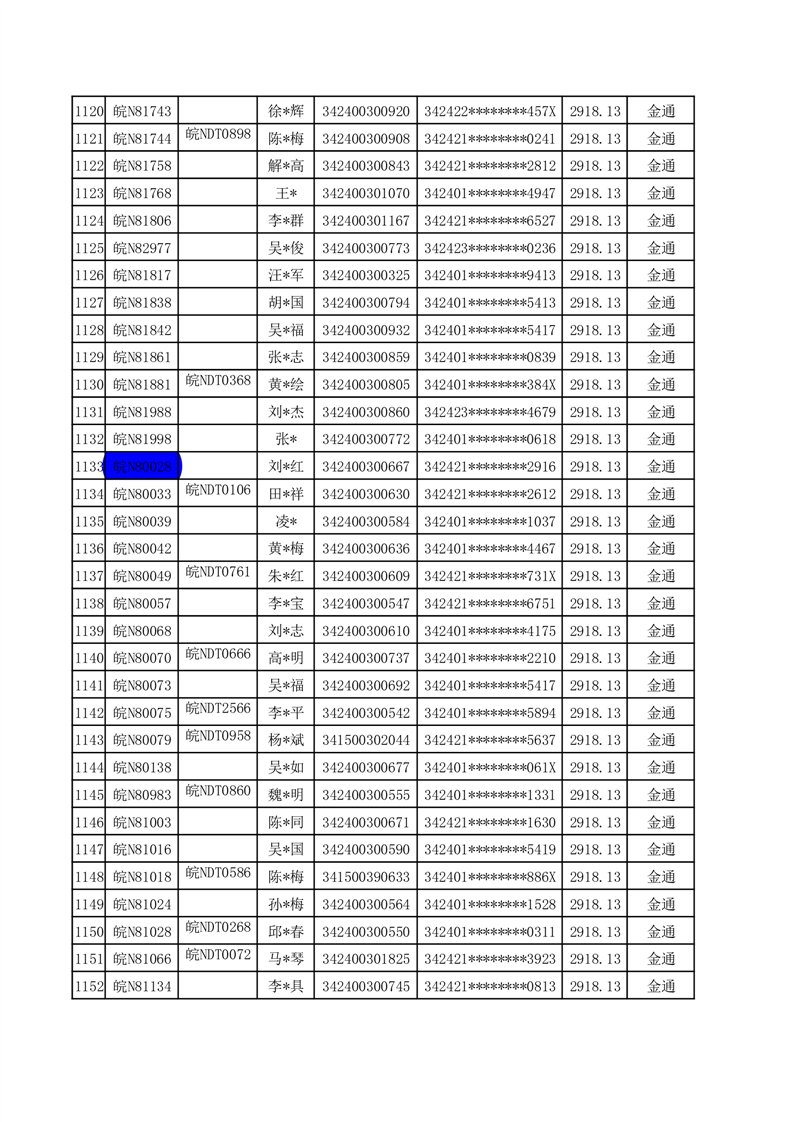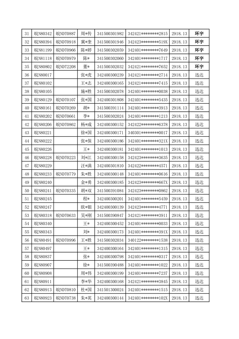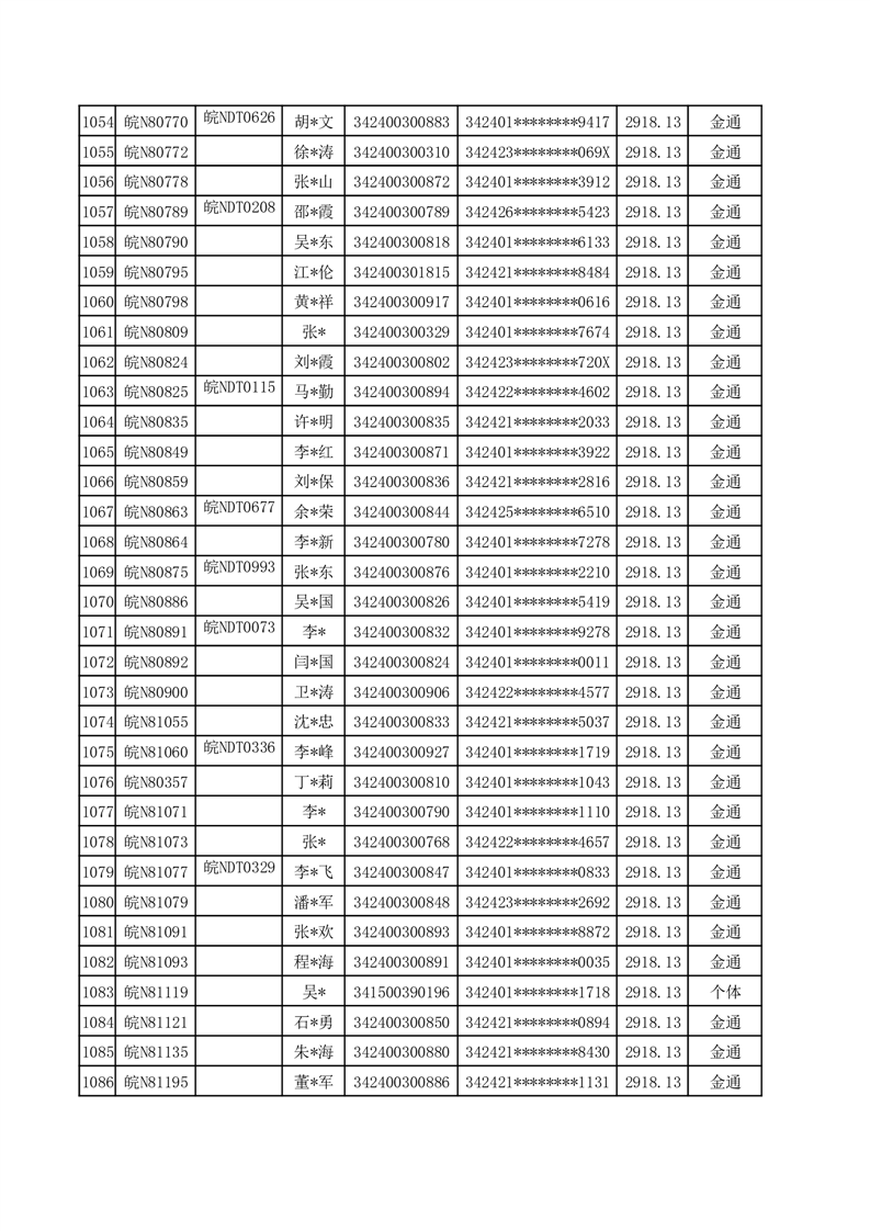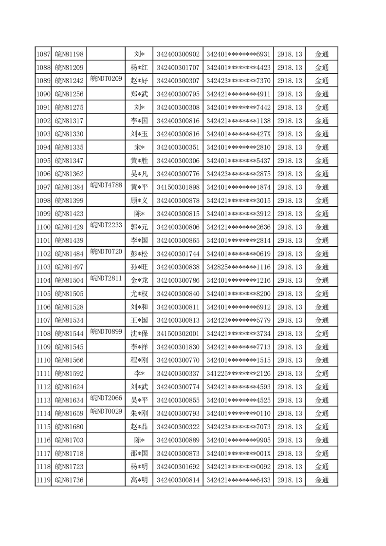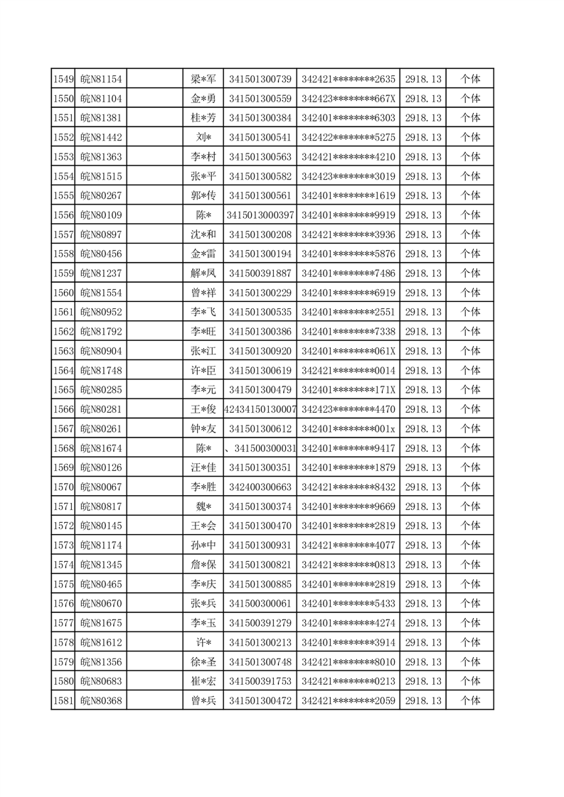《六安城区2024年度出租汽车城市交通发展奖励资金发放信息表》