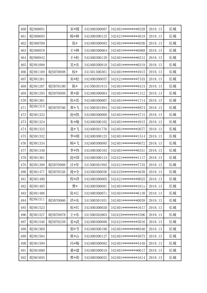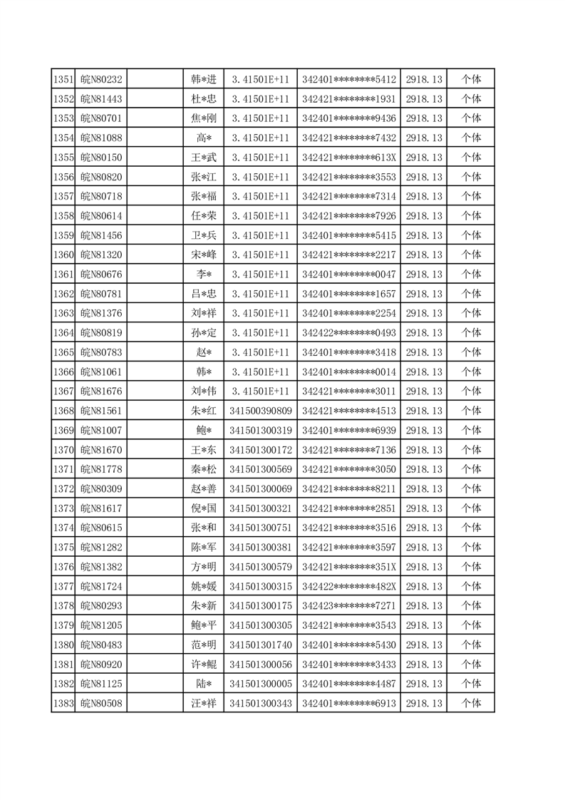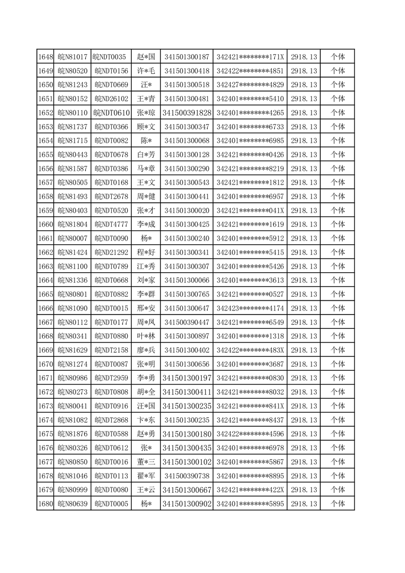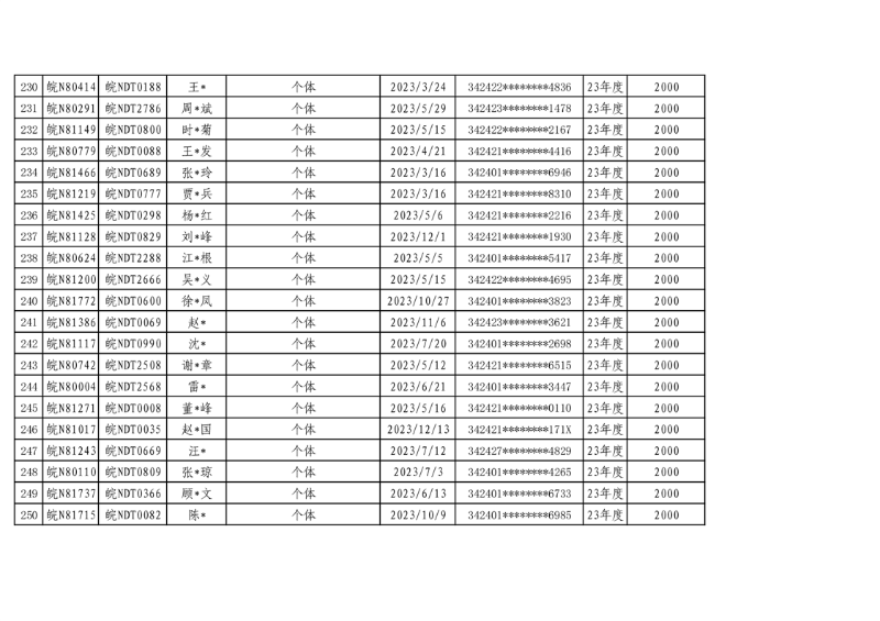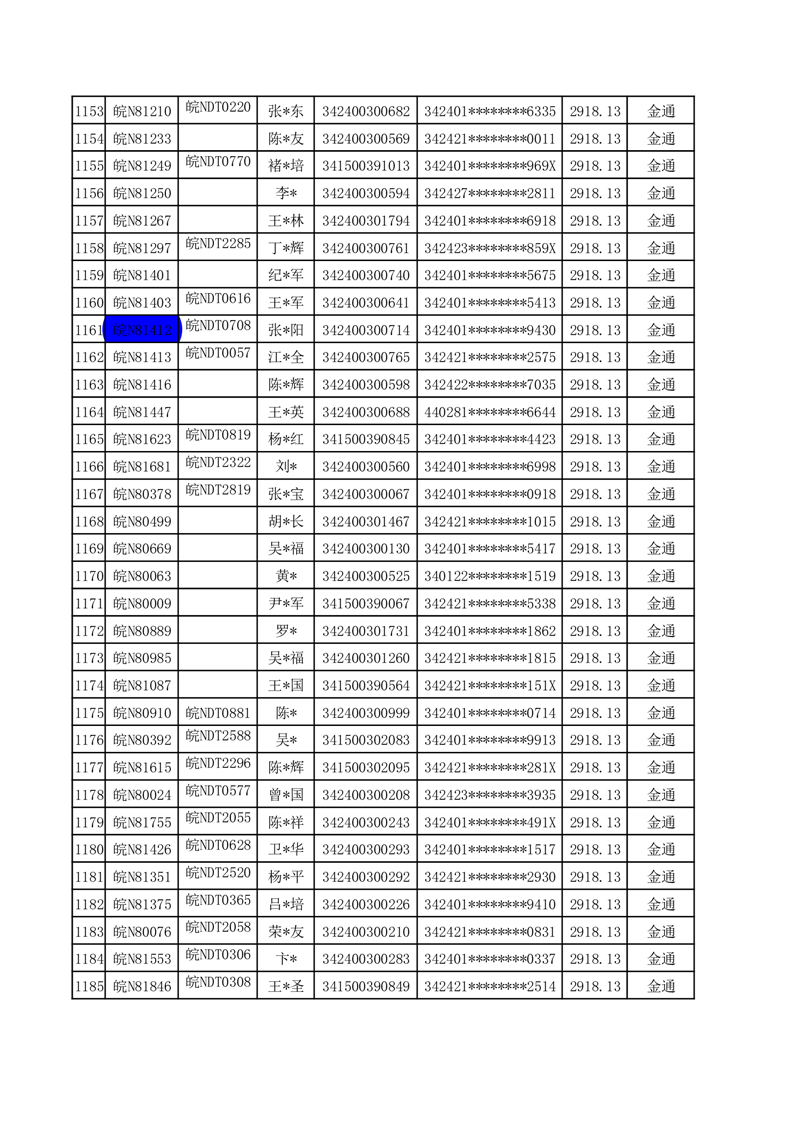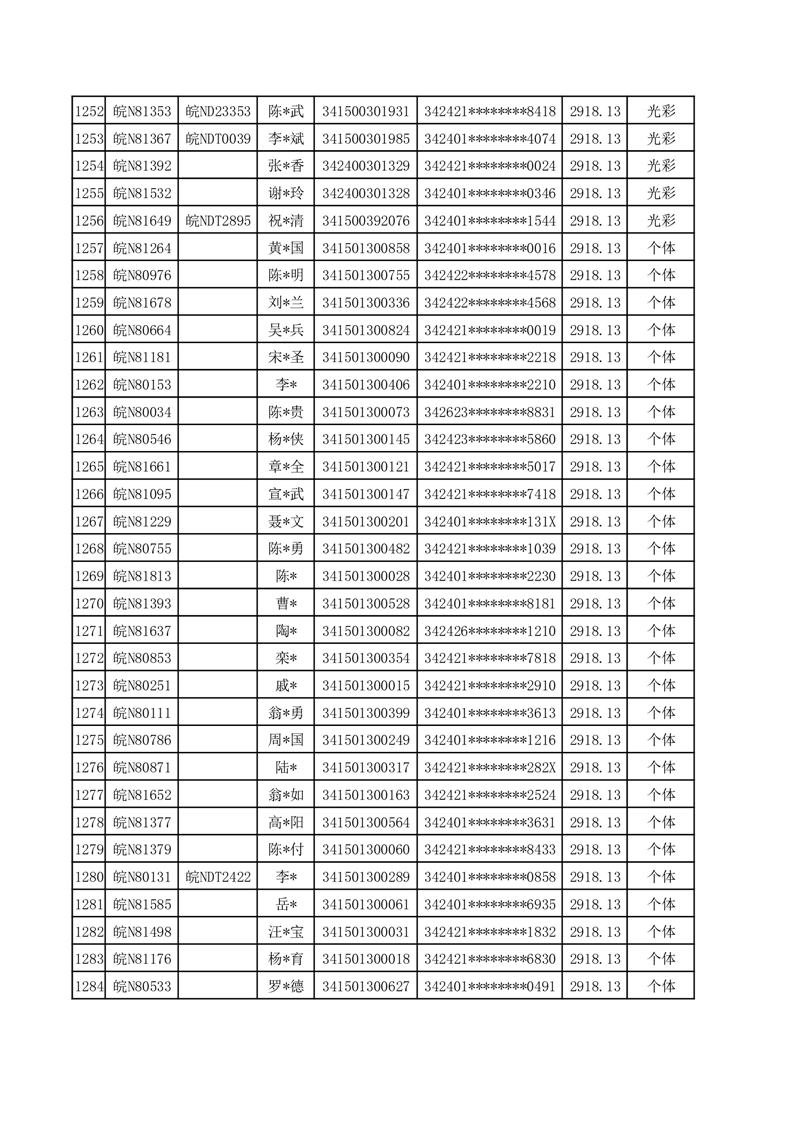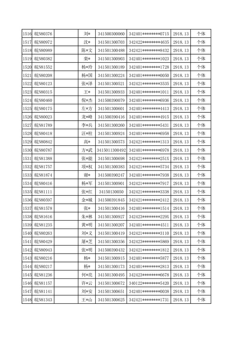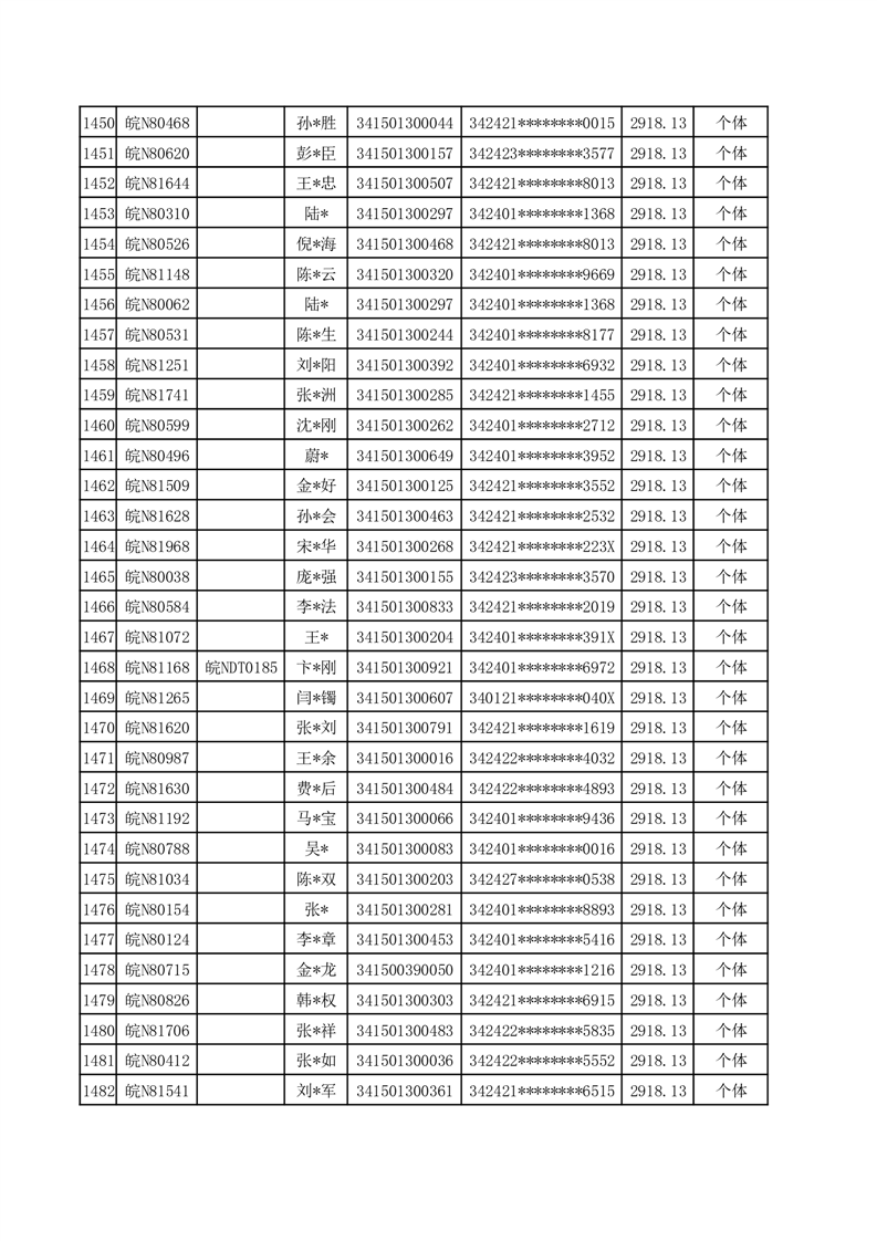 《六安城区2024年度出租汽车城市交通发展奖励资金发放信息表》
