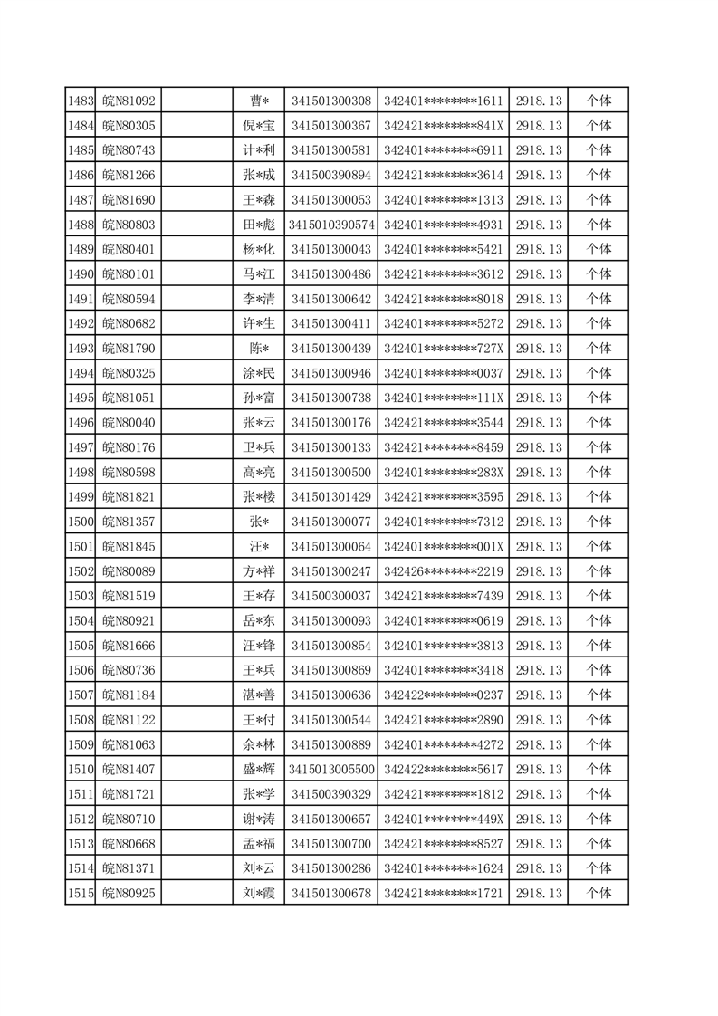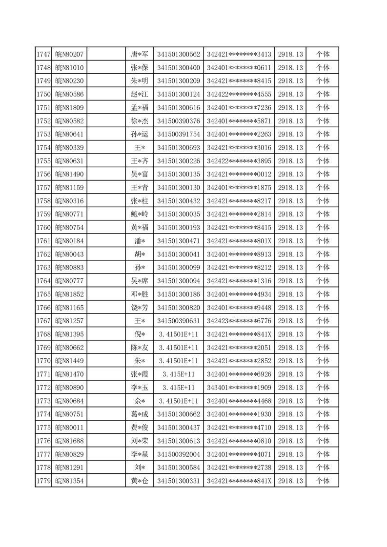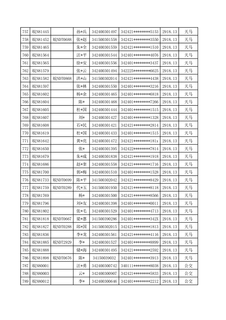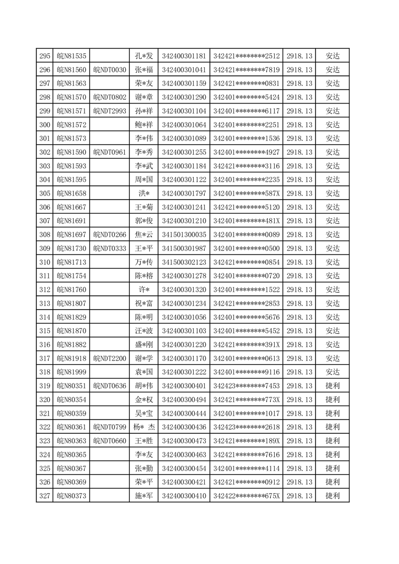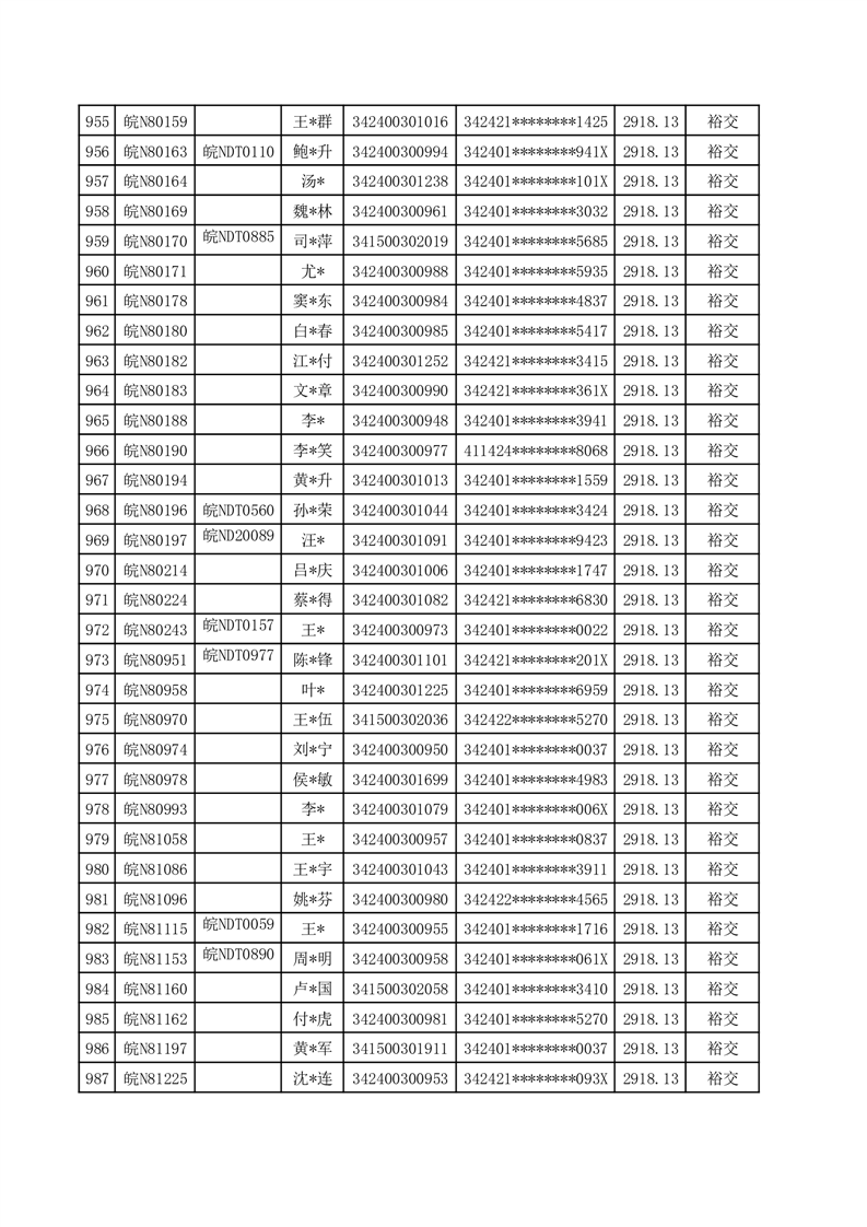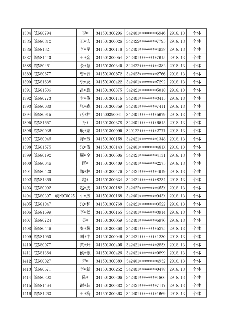 《六安城区2024年度出租汽车城市交通发展奖励资金发放信息表》