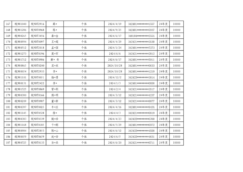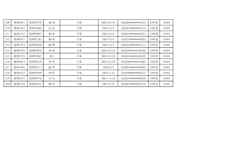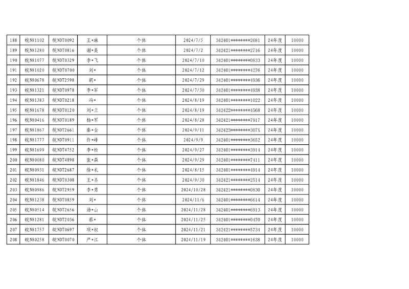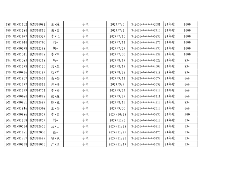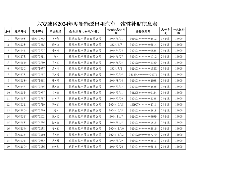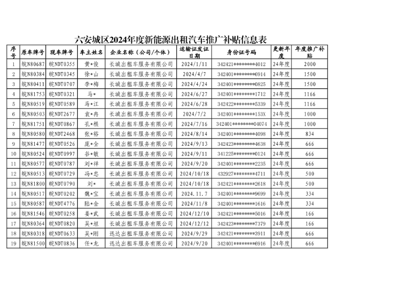 《六安城区2024年度新能源出租汽车一次性补贴信息表》