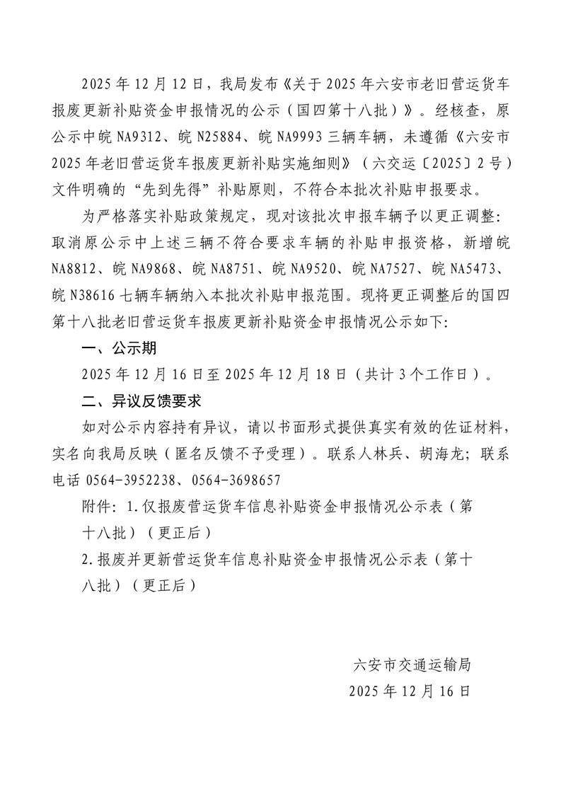 关于2025年六安市老旧营运货车报废更新补贴资金申报情况(国四第十八批)的更正公示