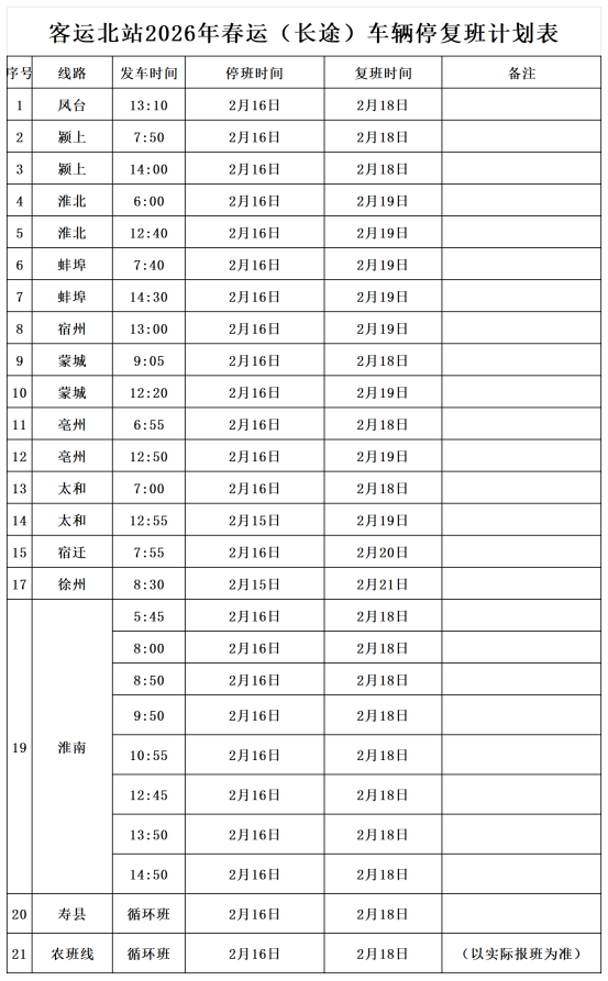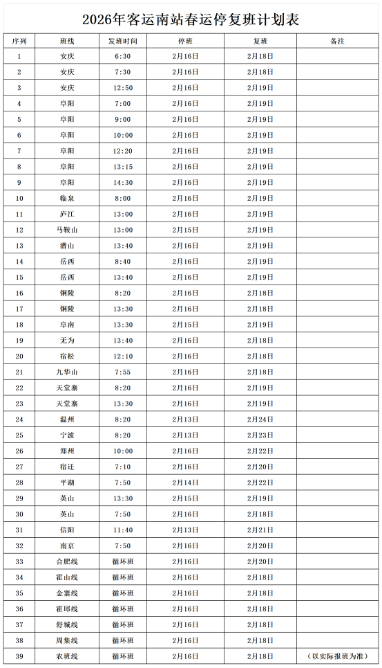 六安市汽车客运总站2026年春节车辆停、复班公告