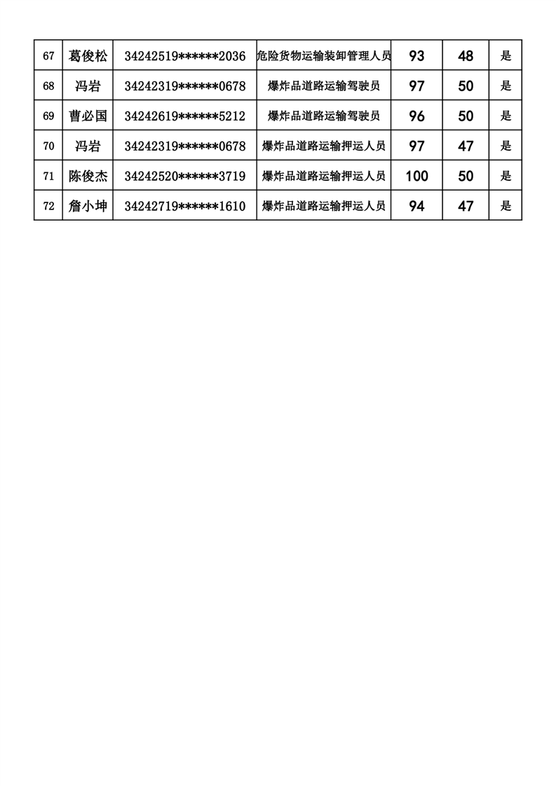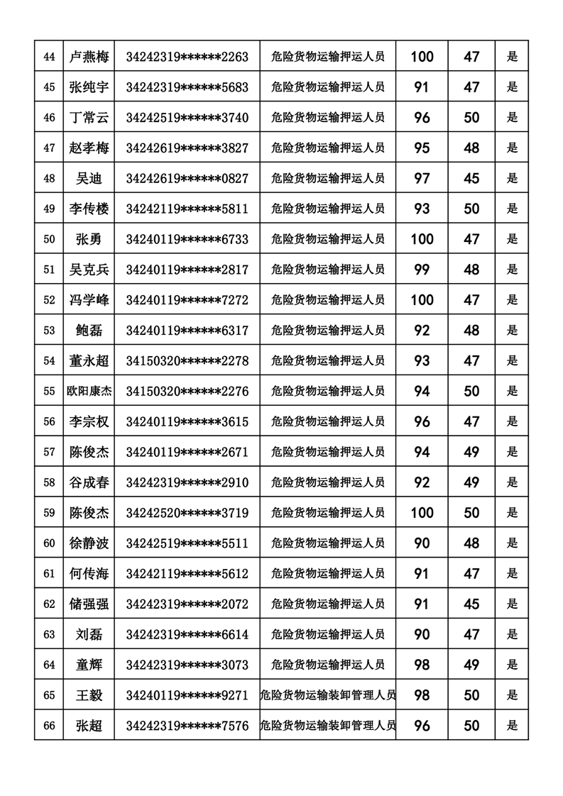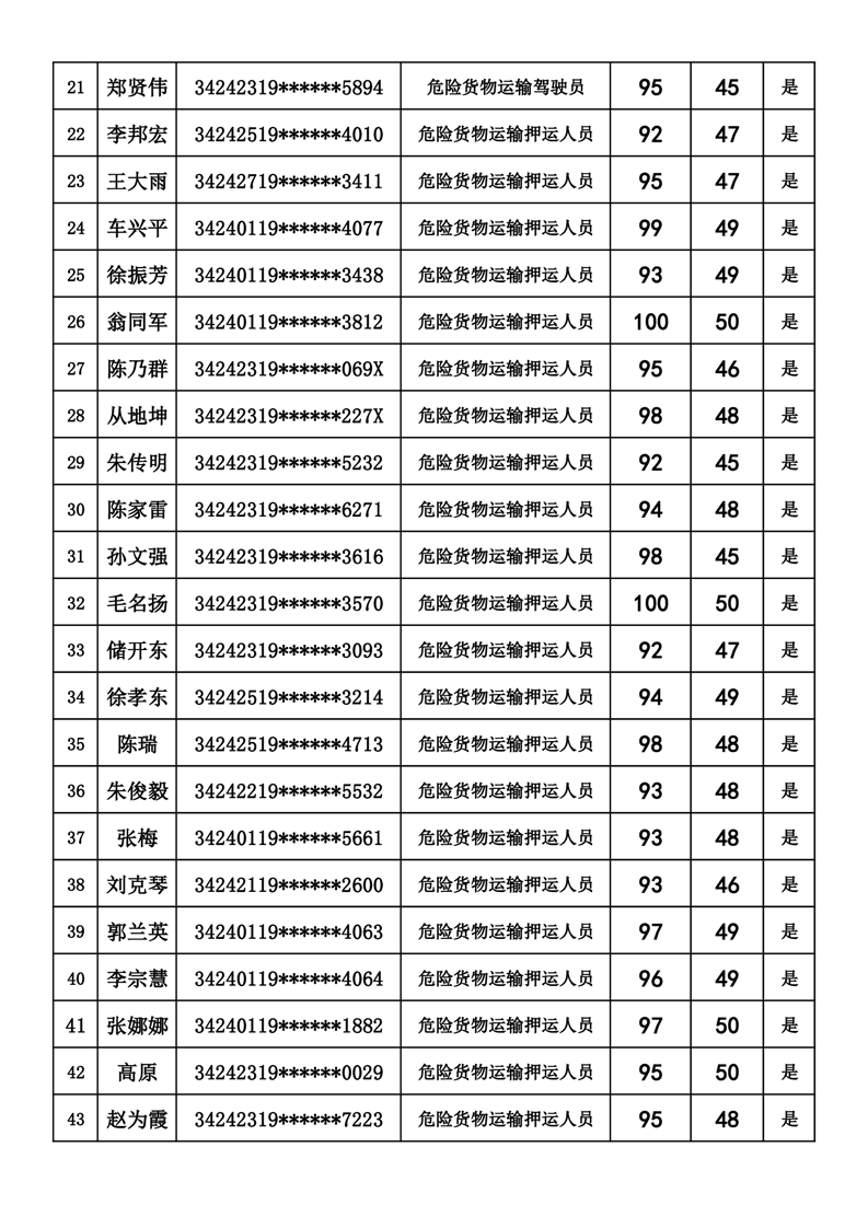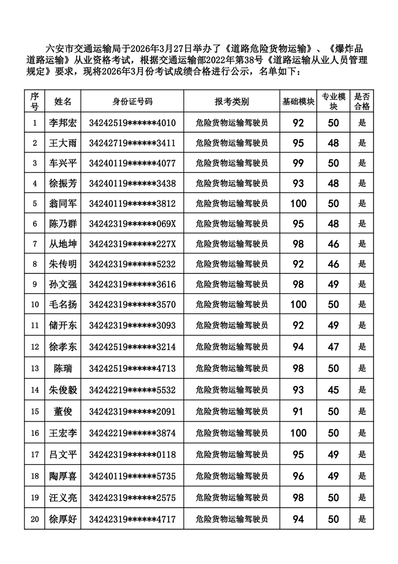 六安市交通运输局《道路危险、爆炸货物运输驾驶员》《道路危险、爆炸货物运输押运人员》《道路危险、爆炸货物运输装卸管理人员》考试成绩公示