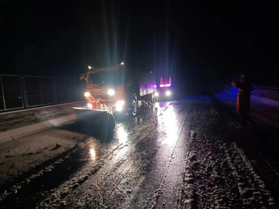 根据县交通运输局连夜调度安排,县公路服务中心和安建工养护单位在白天数次抛撒融雪剂的基础上,夜间为防止路面桥面结冰,天黑后再次出动多台铲雪车、融雪撒布车和养护人员,对G206国道重要险桥险段扫雪除冰。