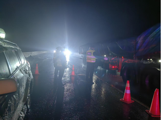 大队值班二中队、三中队执法队员们携带装备,在短短十分钟内集合完毕,交通执法警灯闪烁在漫天飞舞的雪夜,直奔206国道雪夜保畅通的第一线......