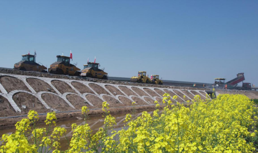 在路基02标段,施工现场机器轰鸣、车辆设备往返穿梭,刚刚铺筑压实的沥青泛着黝黑的光泽。3月12日项目沥青上面层试验段铺装完成后,项目正式进入上面层施工阶段,参建单位抢抓晴好天气,加大人员、设备投入,通过优化作业工序、延长作业时间等方式统筹兼顾,全速推进路面施工,同步开展护栏、标识标牌安装等工作。现场100余台压路机、摊铺机、运输车,70余名作业人员轮番施工,每天铺设沥青中上面层5公里左右。