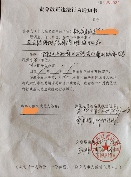 近日,舒城县交通执法大队在公路执法巡查中,查处一起占用公路用地堆放物品案,及时维护了国道干线公路安全畅通。