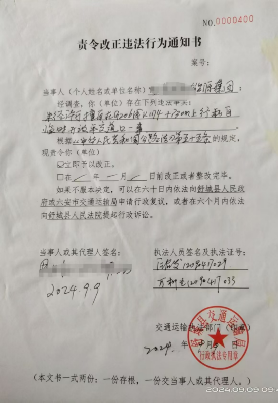 2024年9月9日,舒城县交通执法大队四中队巡查到 G206国道1174k+730处,发现某能源公司未经交通行政许可,擅自在国道上开设平交道口。