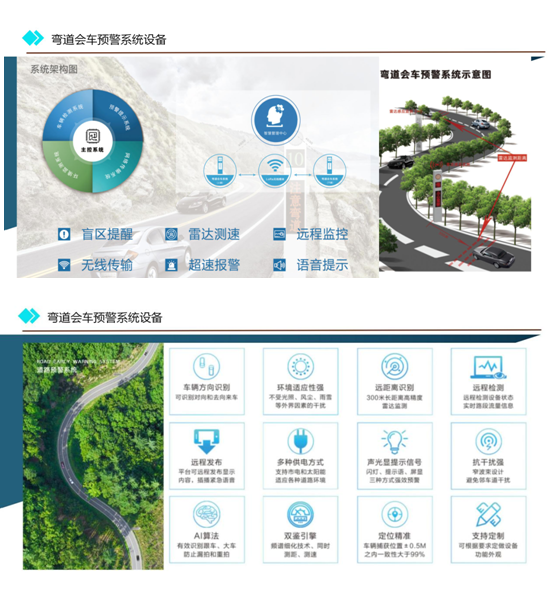 弯道预警系统由雷达、爆闪警示灯、全景摄像机等设备组成,配备了太阳能供电模式,实现智能绿色、环保节能的目标,系统还具备盲区提醒、雷达测速、远程监控、无线传输等功能,其设备可自检、云端运维、远程升级,无需人员值守和人工干预,对弯道以及复杂路段实现不间断的监测,实现了自动化运行和稳定可靠的性能。
