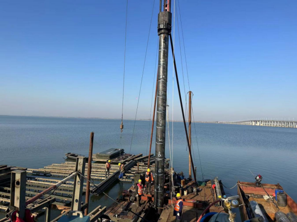 人勤春来早,奋进正当时。蛇年春节伊始,户外寒风凛冽。S20长丰至固始高速公路霍邱至皖豫界段项目城西湖大桥施工现场,高高耸立在湖面的打桩机不停地轰鸣,在施工人员熟练的操作下,将硕大的钢管桩一根接一根地沉入湖底,为即将全面开始的大桥建设打下坚实基础。