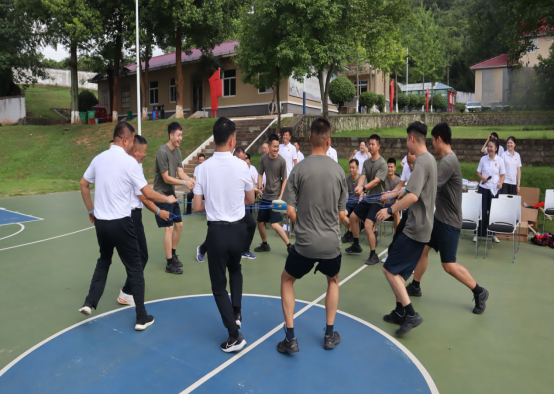 比赛场上,红蓝两队展开四轮激烈角逐。战鼓同心环节,军民双手共执鼓绳,颠球冲刺中步伐精准协同;鱼水传珠环节,长筷接力运球,指尖传递默契;钢铁车轮环节,布质“履带”内,养路工与战士高呼号子并肩冲锋;齐心竞走环节,绑腿竞速中跌倒的战士被职工一把扶起,全员携手撞线!“胜负不重要,重要的是比赛中结下的情谊!”中心退役军人汪洋抹着汗笑道。这场打破身份界限的混合编组赛,让“军民团结如一人”从口号变为现实。