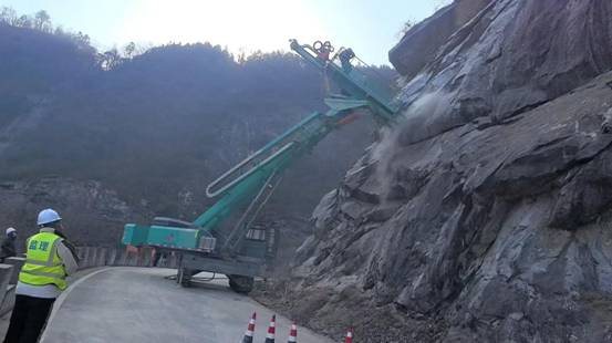 科学设计处置,采用先进机械。根据每处点位实际,因地制宜设计施工方案,多措并举构筑公路边坡山体安全屏障。一是调用长臂挖掘机清理高处危岩,破解高边坡人工排险难、普通机械作业高度不够难题;二是采用液压式锚杆钻机打孔,随机锚杆或预应力锚杆锚固山体的作业方式,避免深层较大潜在滑移面山体发生灾害;三是采用柔性主动网防止山体表面风化破碎、土石混合边坡落石。
