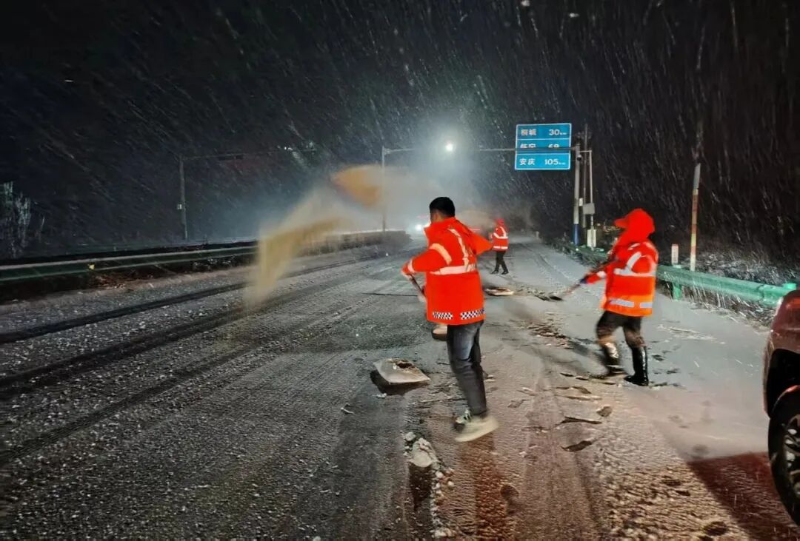 科学调度,打好除冰防御战。坚持“机械为主、人工协同,预防为先、保障重点”原则,科学有序展开攻坚。巡查人员加密对桥梁、陡坡、弯道及山区背阴路段巡查;信息中心依托监测平台,24小时不间断掌握全县路况。为预防结冰,抢抓低温冻融关键期,对重点部位实施多轮预防性融雪剂撒布。随着雪情持续,全力调度机械力量清雪。